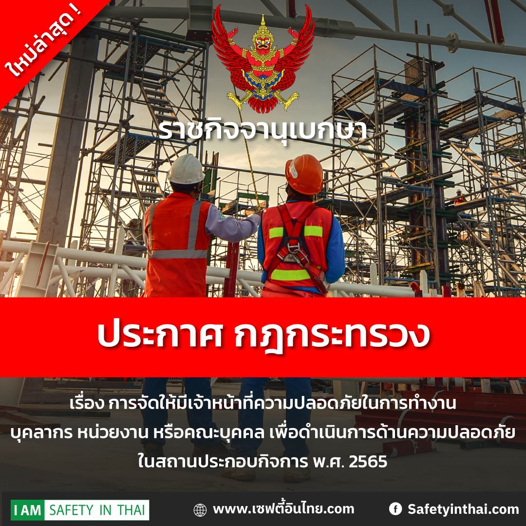 เรื่อง การจัดให้มีเจ้าหน้าที่ความปลอดภัยในการทำงานบุคลากร หน่วยงาน หรือคณะบุคคล เพื่อดำเนินการด้านความปลอดภัยในสถานประกอบกิจการ พ.ศ. 2565