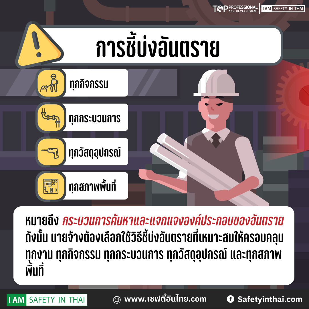 การชี้บ่งอันตราย หมายถึง กระบวนการค้นหาและแจกแจงองค์ประกอบของอันตราย ดังนั้น นายจ้างต้องเลือกใช้วิซีซื้บ่งอันตรายที่เหมาะสมให้ครอบคลุมทุกงาน ทุกกิจกรรม ทุกกระบวนการ ทุกวัสดุอุปกรณ์ และทุกสภาพพื้นที่ เพื่อให้เกิดความปลอดภัยและอาชีวอนามัยต่อลูกจ้าง ผู้รับเหมา ผู้เยี่ยมชม และบุคคลภายนอก