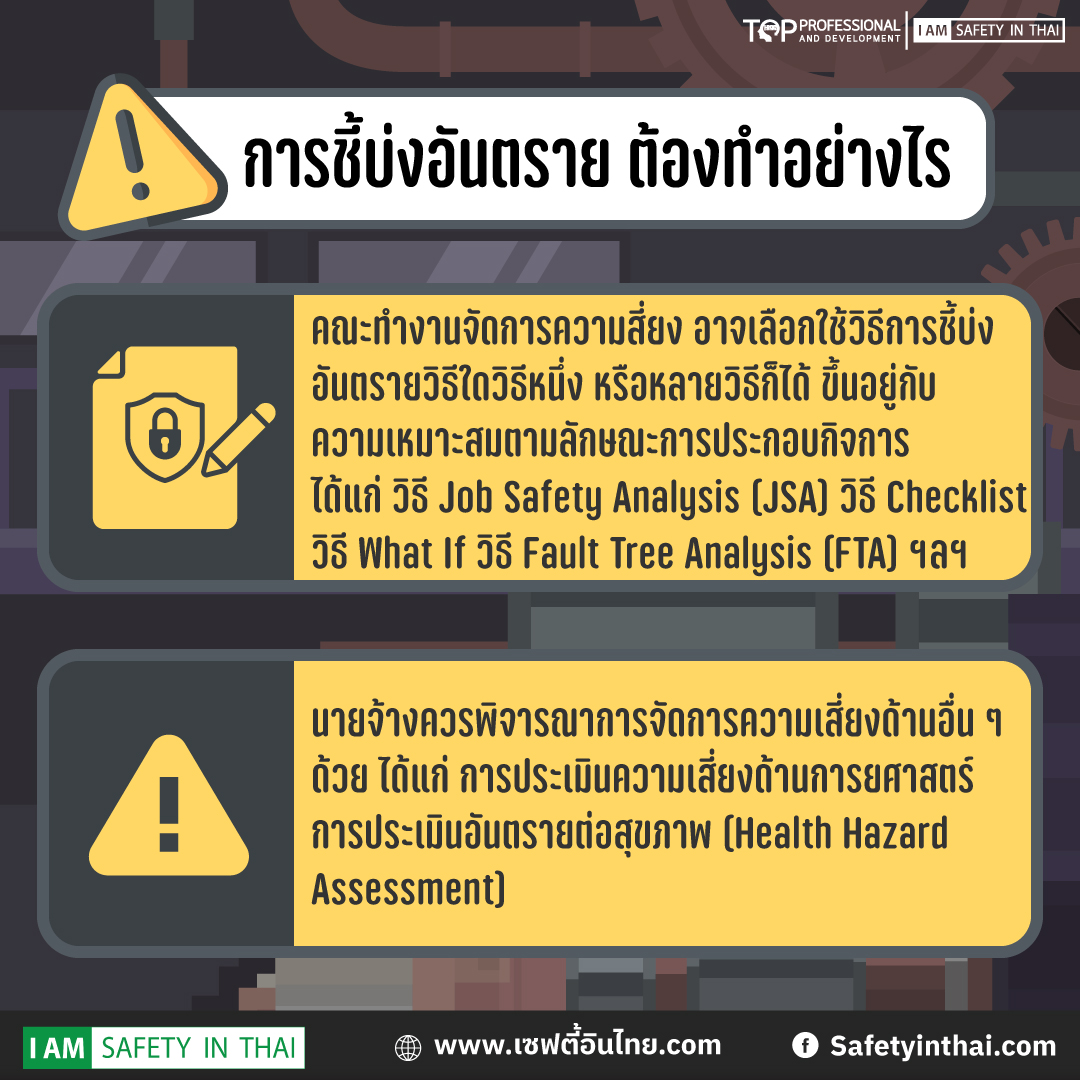 นายจ้างต้องกำหนดหน้าที่และความรับผิดชอบของผู้ที่ต้องทำการชี้บ่งอันตรายแต่ละวิธีให้ครอบคลุมทั้งสถานประกอบกิจการนายจ้างต้องจัดทำขั้นตอนการดำเนินงานในการชี้บ่ง และติตตามกฎหมายความปลอดภัย อาชีวอนามัย และสภาพแวดล้อมในการทำงาน ที่เกี่ยวข้องกับสถานประกอบกิจการให้เป็นปัจจุบันอยู่เสมอ คณะทำงานจัดการความเสี่ยง อาจเลือกใช้วิธีการชี้บ่งอันตรายวิธีใตวิธีหนึ่ง หรือหลายวิธีก็ได้ ขึ้นอยู่กับความเหมาะสมตามลักษณะการประกอบกิจการ หรือลักษณะความเสี่ยงจากอันตรายที่ อาจเกิดขึ้นจากการประกอบกิจการ ได้แก่ วิธี Job Safety Analysis (JSA) วิธี Checklist วิธี What If วิธี Hazard andOperability Studies (HAZOP) วิธี Failure Mode and Effect Analysis (FMEA) วิธี Fault Tree Analysis (FTA) หรือวิธี Event Tree Analysis (ETA)