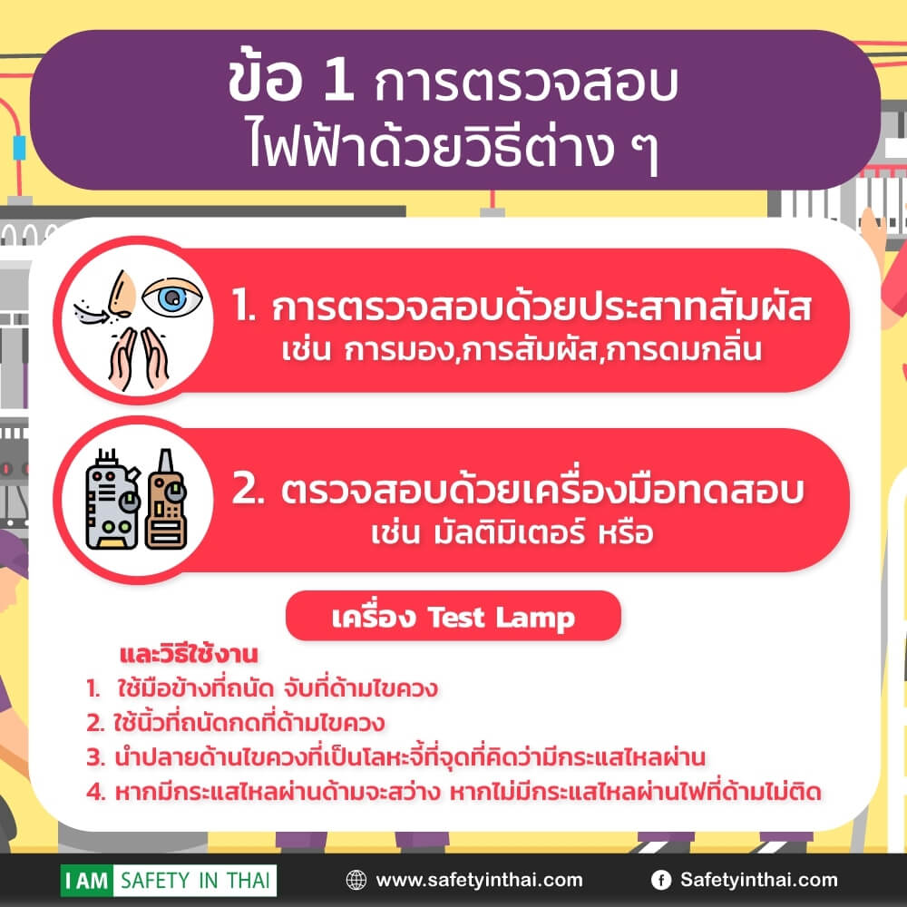 1. การตรวจสอบด้วยประสาทสัมผัส เราสามารถตรวจสภาพการทำงาน โดยการดูสภาพของอุปกรณ์ไฟฟ้า กลิ่น หรือแม้กระทั่งการสัมผัส เช่น สภาพของขั้วไฟฟ้าที่อยู่ในวงจร สภาพของคันโยกเบรกเกอร์ โดยวิธีการนี้ อาจมีการกำหนดมาตรฐานขึ้นมา เช่น กำหนดเป็นภาพของเบรกเกอร์ ในสภาวะการทำงานปกติ เพื่อใช้เปรียบเทียบในการตรวจสอบ เป็นต้น