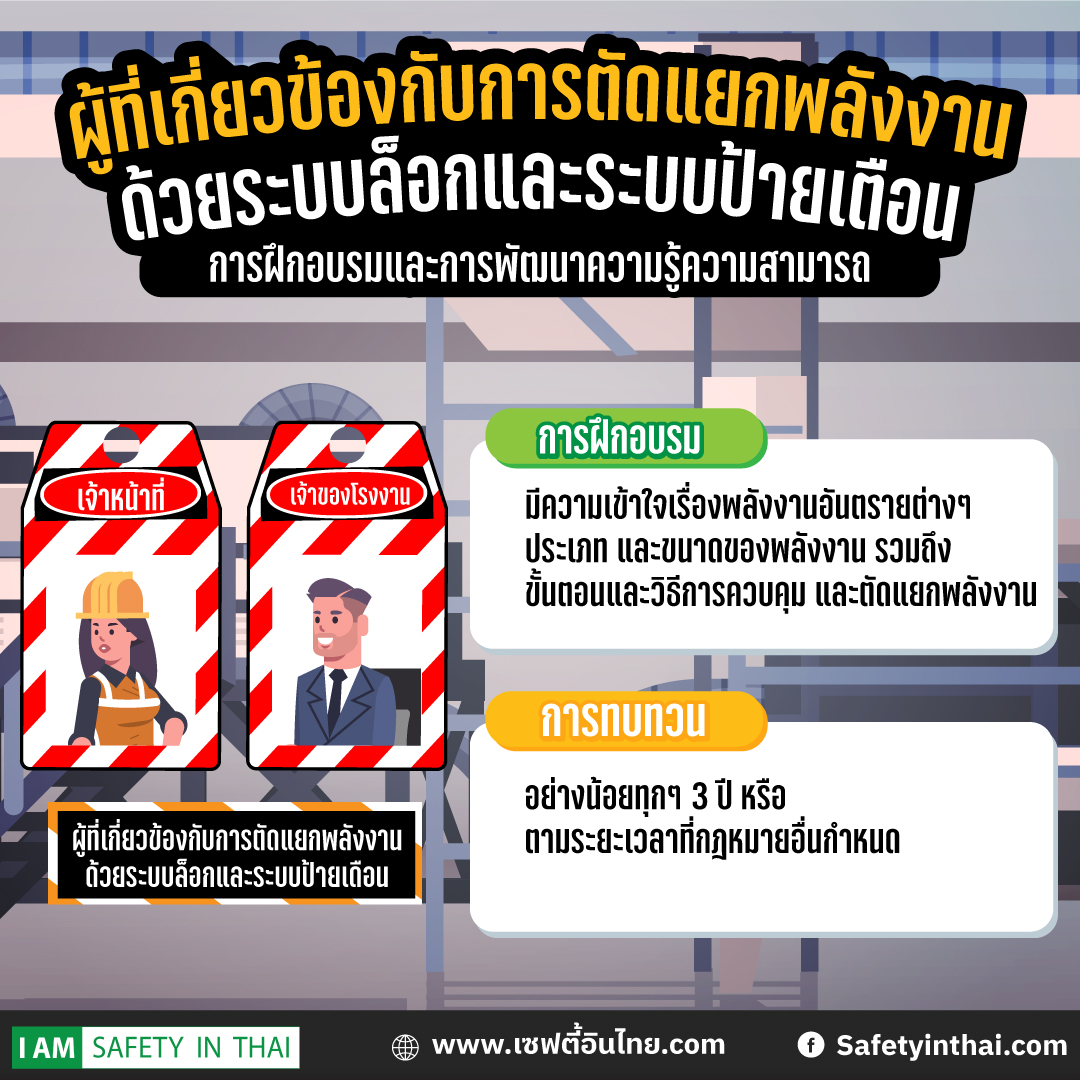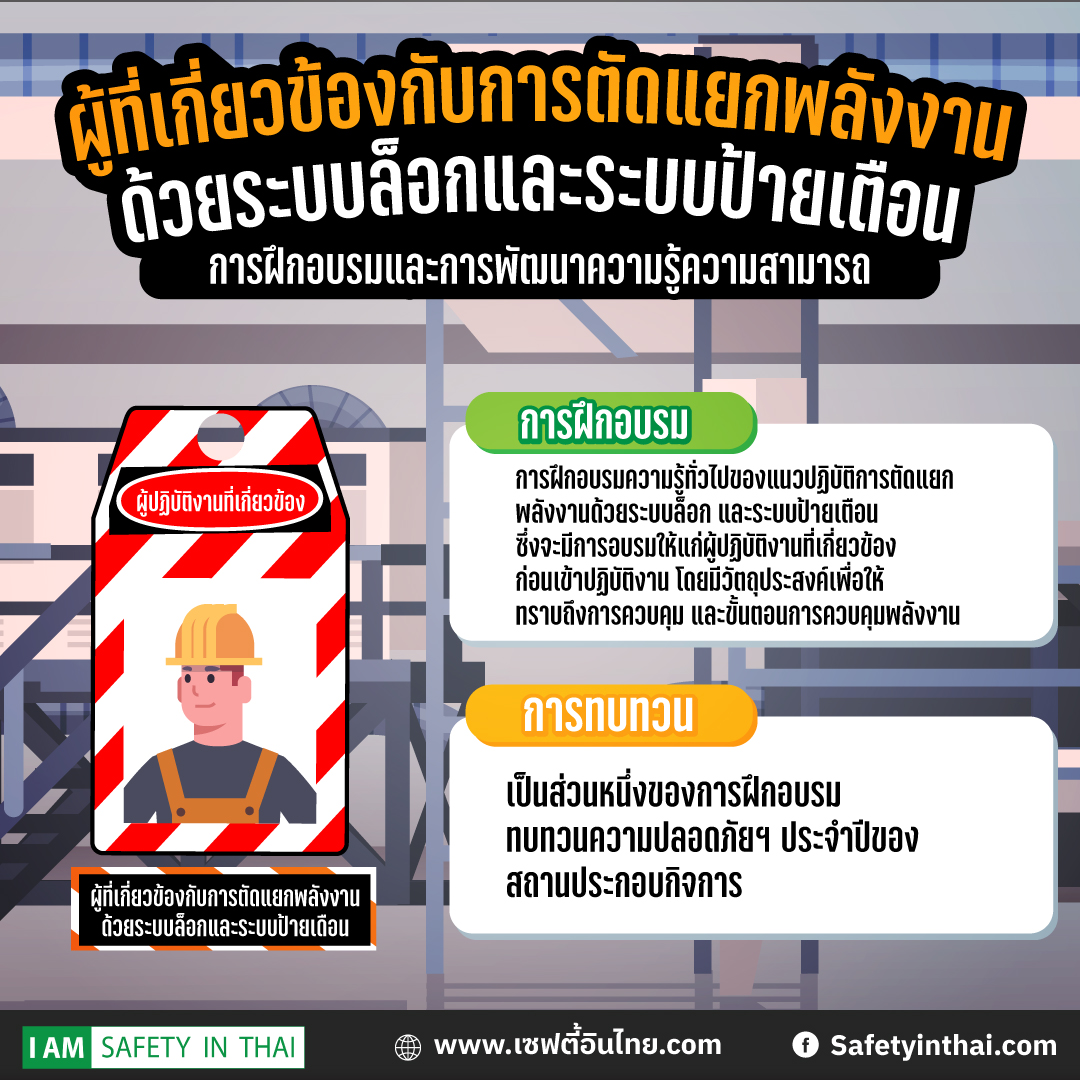 2. ผู้ปฏิบัติงานที่เกี่ยวข้อง | ความรู้ทั่วไปของแนวปฏิบัติการตัดแยกพลังงานด้วยระบบล็อก และระบบป้ายเตือน ซึ่งจะมีการอบรมให้แก่ผู้ปฏิบัติงานที่เกี่ยวข้อง ก่อนเข้าปฏิบัติงาน โดยมีวัตถุประสงค์เพื่อให้ทราบถึงการควบคุม และขั้นตอนการควบคุมพลังงาน | เป็นส่วนหนึ่งของการฝึกอบรมทบทวนความปลอดภัยฯ ประจำปีของสถานประกอบกิจการ |