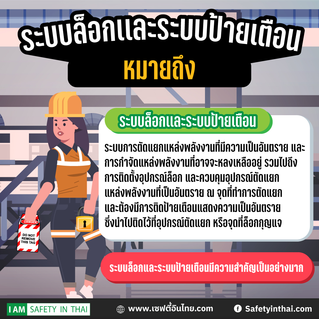 ระบบล็อกและระบบป้ายเตือน (Lock out/Tag out System; LOTO) หมายถึง ระบบการตัดแยกแล่งพลังงานที่มีความเป็นอันรายแะการกำจัดแหล่งพลังงนที่อาจะหลงเหลืออยู่ วมไปถึงการติตตั้งอุปกรณ์ล็อกและควบคุมอุปกรณ์ตัดแยกแหล่งพสังงานที่เป็นอันตราย ณ จุดที่ทำการตัดแยก(Isolation Point) และต้องมีการติตป้ายเตือนแสดงความเป็นอันตราย ซึ่งนำไปติดไว้ที่อุปกรณ์ตัดแยกหรือจุดที่ล็อกกุญแจ