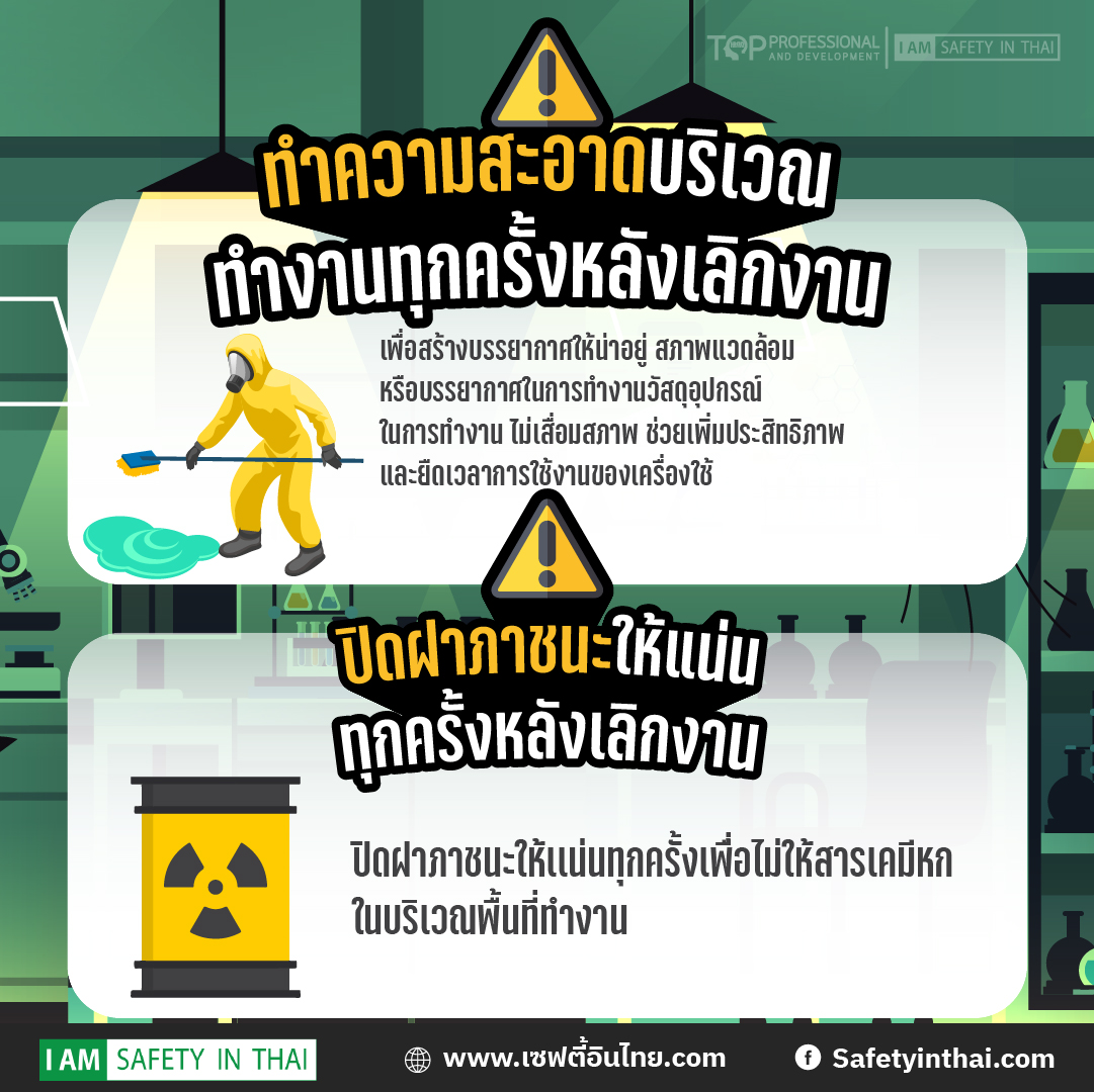 ปิดฝาภาชนะให้เเน่นทุกครั้งเพื่่อไม่ให้สารเคมีหกในบริเวณพื้นที่ทำงาน