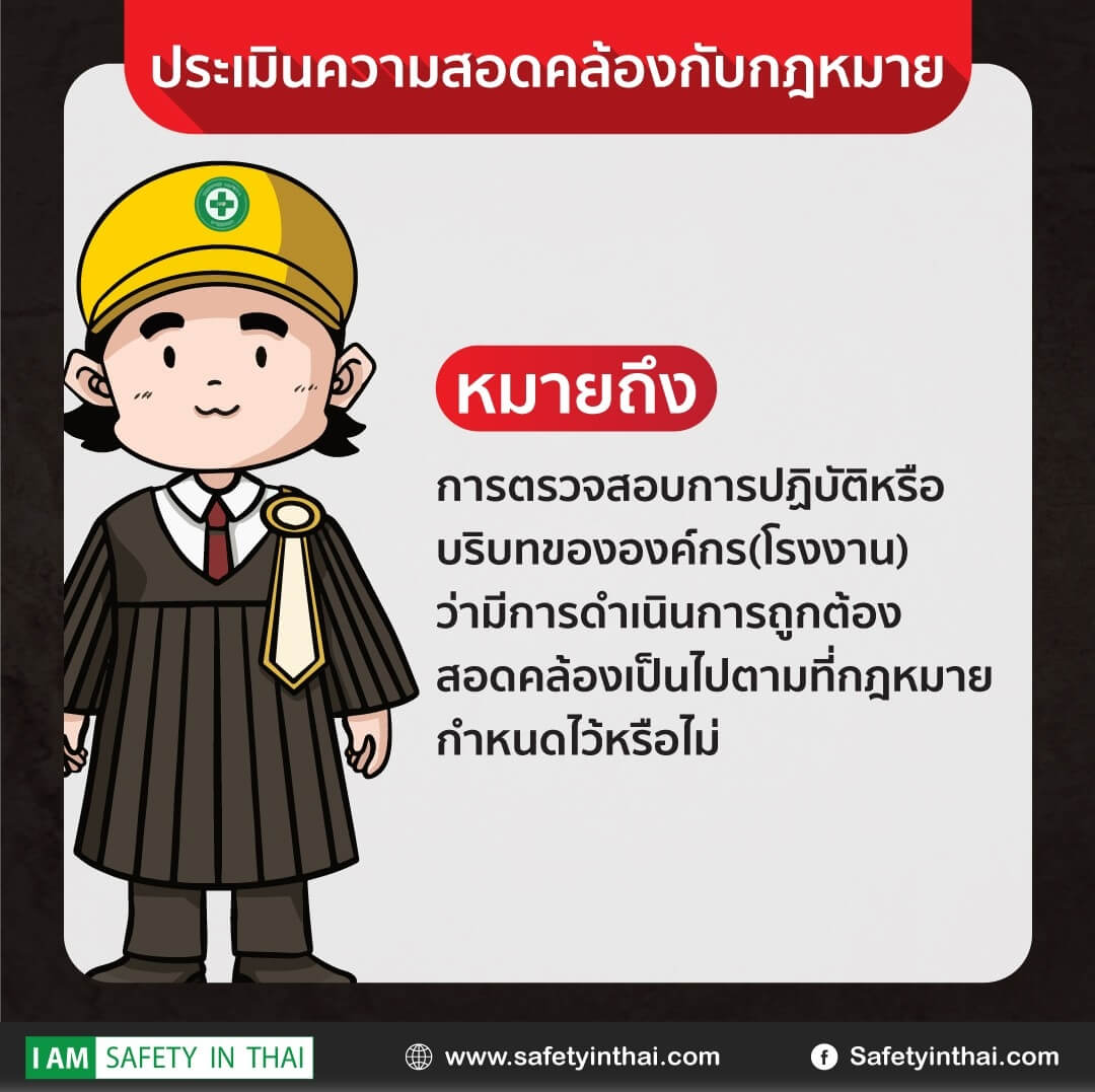 ประเมินความสอดคล้องกับกฎหมาย หมายถืง การตรวจสอบการปฏิบัติหรือบริบทขององค์กร(โรงงาน) ว่ามีการดำเนินการถูกต้องสอดคล้องเป็นไปตามที่กฎหมายกำหนดไว้หรือไม่ ?