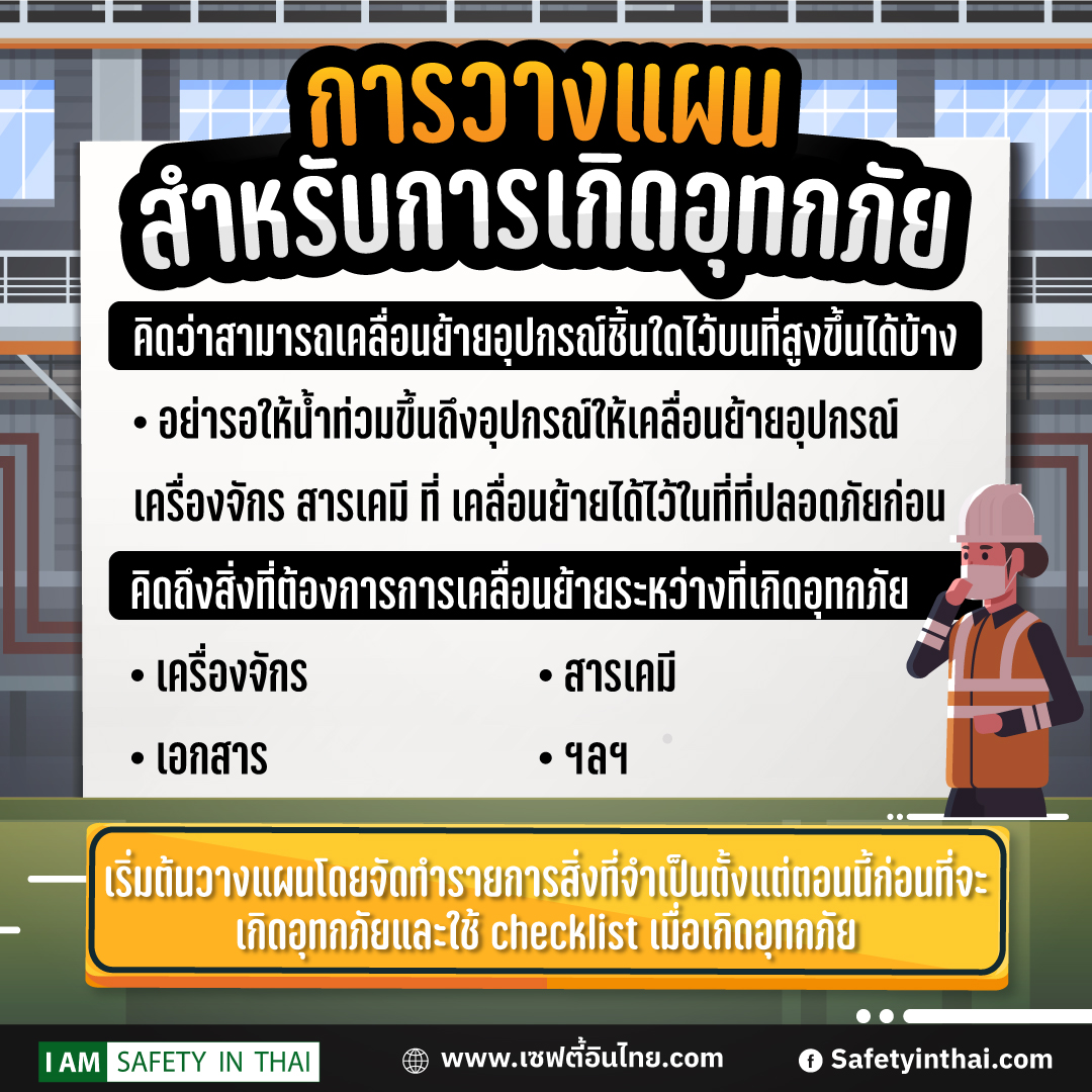 • อย่ารอให้น้ำท่วมขึ้นถึงอุปกรณ์ให้เคลื่อนย้ายอุปกรณ์ เครื่องจักร สารเคมี ที่