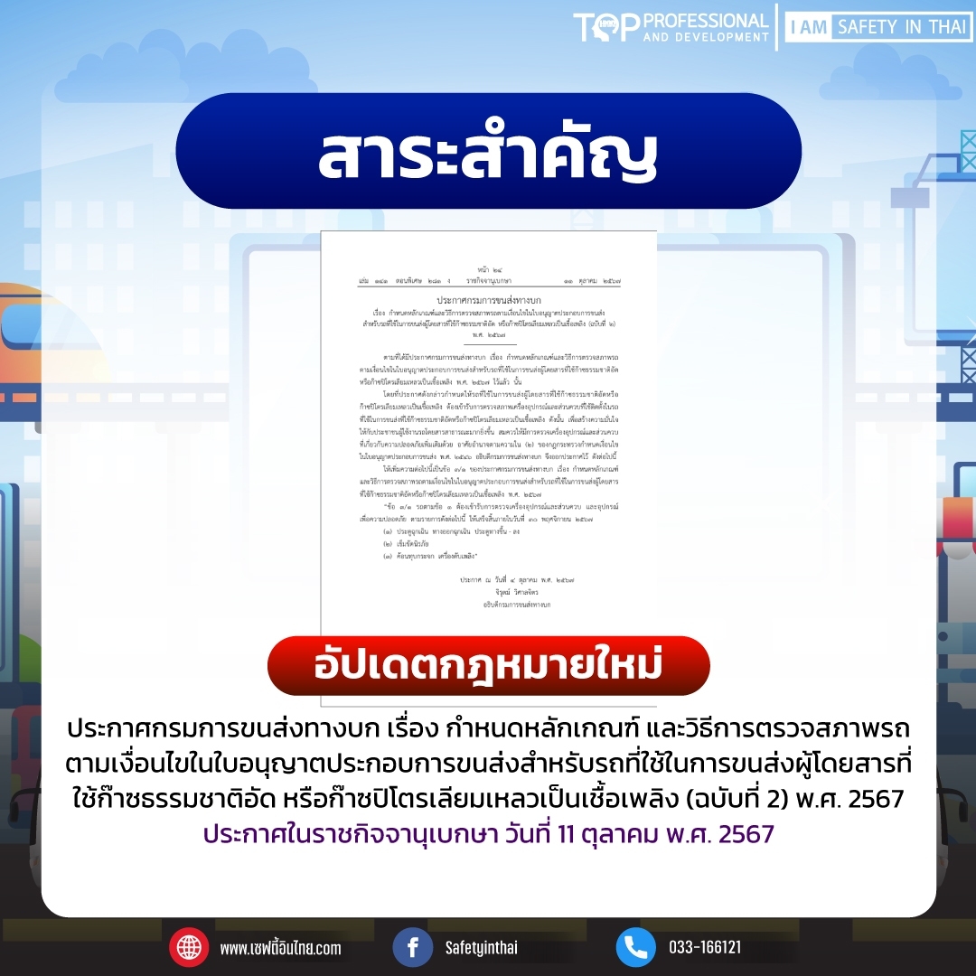 ประกาศกรมการขนส่งทางบกเรื่อง กำหนดหลักเกณฑ์และวิธีการตรวจสภาพรถตามเงื่อนไขในใบอนุญาตประกอบการขนส่งสำหรับรถที่ใช้ในการขนส่งผู้โดยสารที่ใช้ก๊าซธรรมชาติอัด หรือก๊าซปิโตรเลียมเหลวเป็นเชื้อเพลิง (ฉบับที่ ๒)พ.ศ. ๒๕๖๗