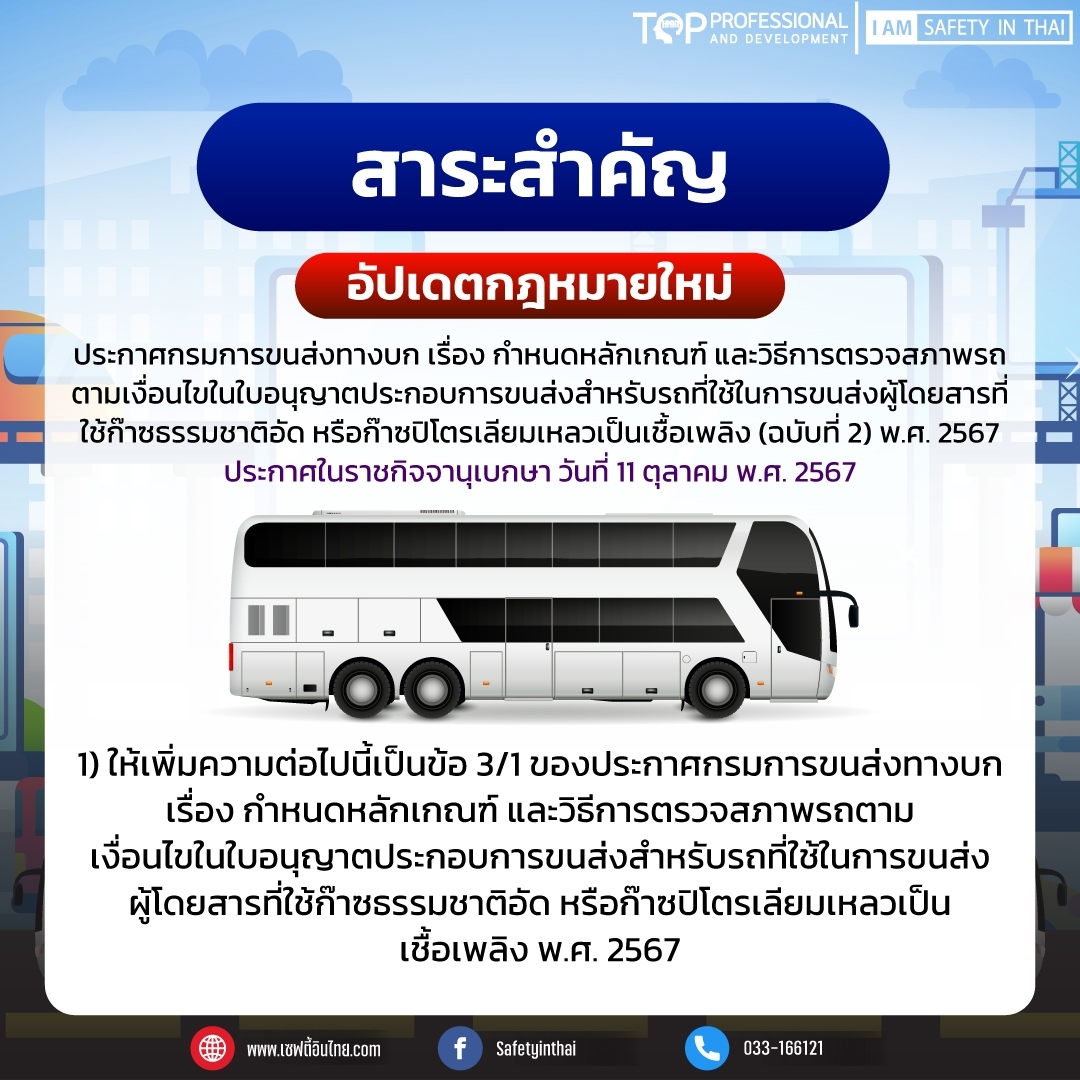 ให้เพิ่มความต่อไปนี้เป็นข้อ ๓/๑ ของประกาศกรมการขนส่งทางบก เรื่อง กำหนดหลักเกณฑ์และวิธีการตรวจสภาพรถตามเงื่อนไขในใบอนุญาตประกอบการขนส่งสำหรับรถที่ใช้ในการขนส่งผู้โดยสารที่ใช้ก๊าซธรรมชาติอัดหรือก๊าซปิโตรเลียมเหลวเป็นเชื้อเพลิง พ.ศ. ๒๕๖๗