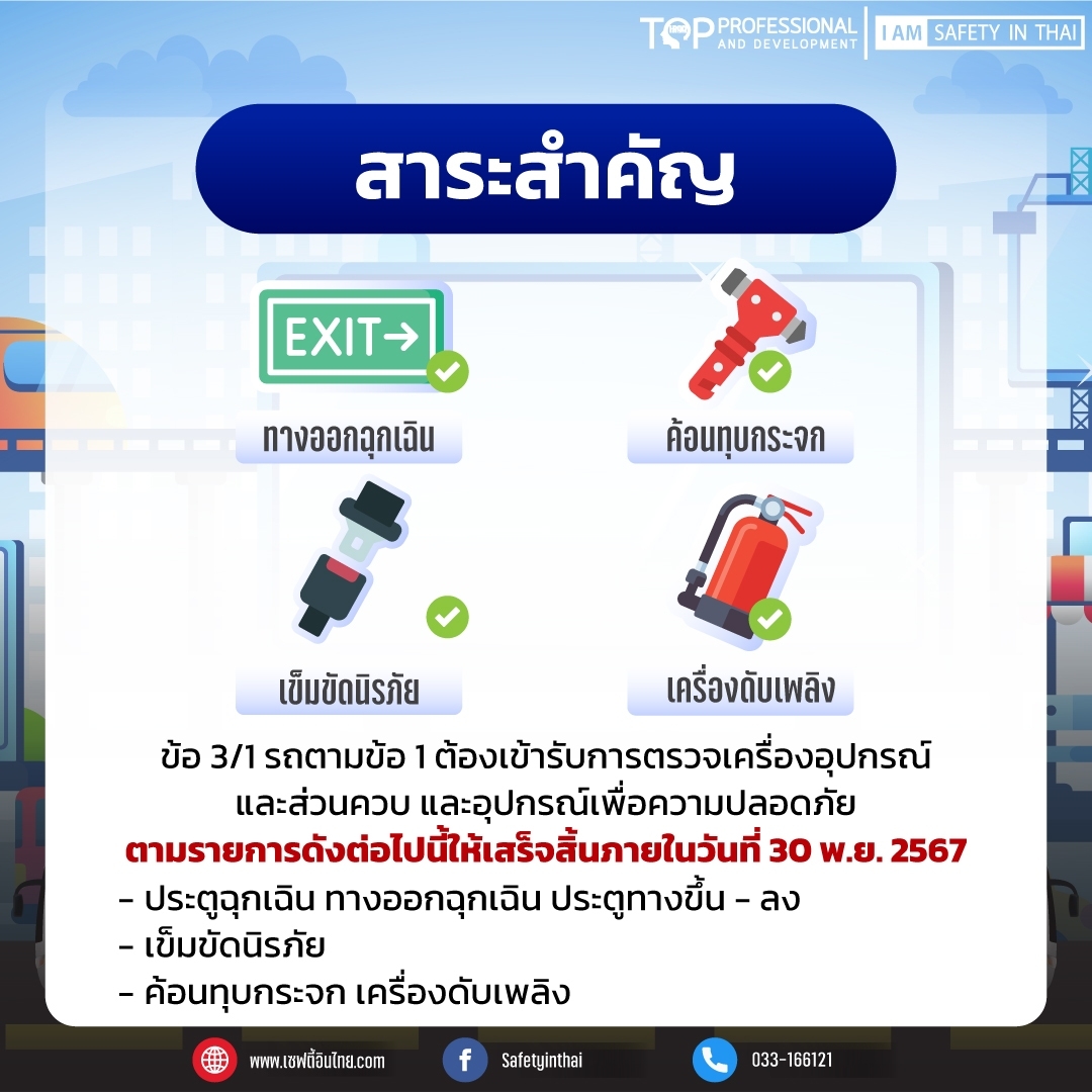 "ข้อ ๓/๑ รถตามข้อ ๑ ต้องเข้ารับการตรวจเครื่องอุปกรณ์และส่วนควบ และอุปกรณ์เพื่อความปลอดภัย ตามรายการดังต่อไปนี้ ให้เสร็จสิ้นภายในวันที่ ๓๐ พฤศจิกายน ๒๕๖๗