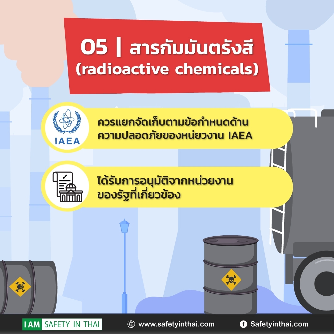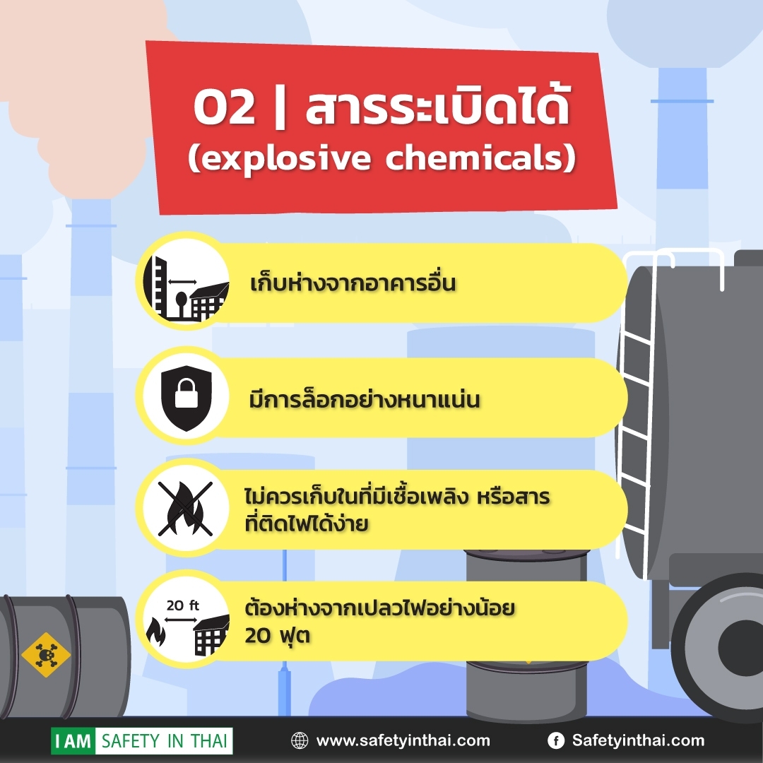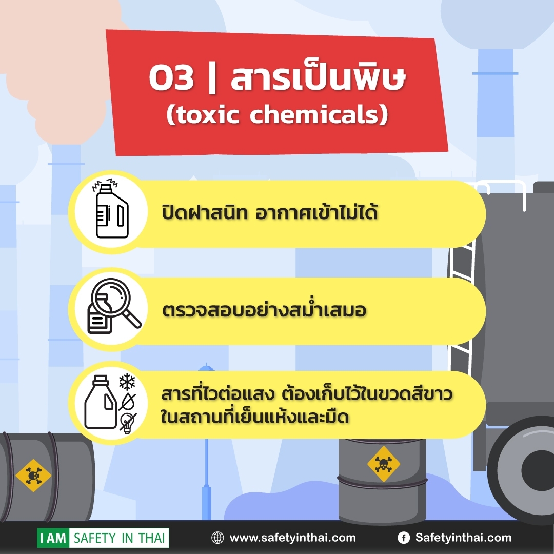 - ต้องมีการตรวจสอบอย่างสม่ำเสมอ ทั้งภาชนะที่เก็บและบริเวณที่เก็บสารนั้นๆ