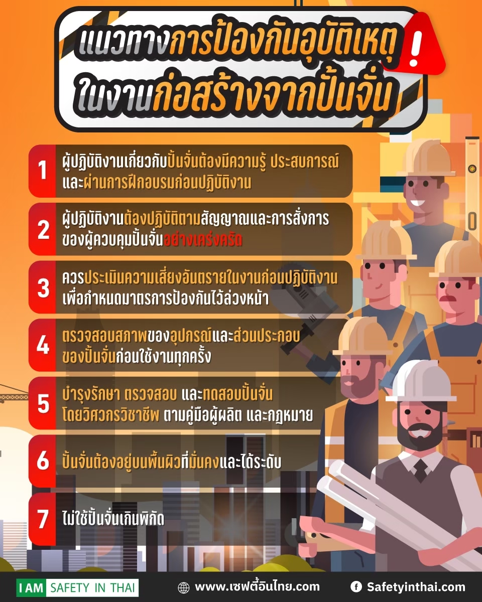 หมายเหตุ : ข้อมูลนี้เป็นเพียงแนวทางทั่วไป ควรปรึกษาผู้เชี่ยวชาญด้านความปลอดภัยในการทำงานเพื่อขอคำแนะนำเพิ่มเติม หรือต้องการอบรมทบทวนการทำงานเกี่ยวกับปั้นจั่น คลิกที่นี่