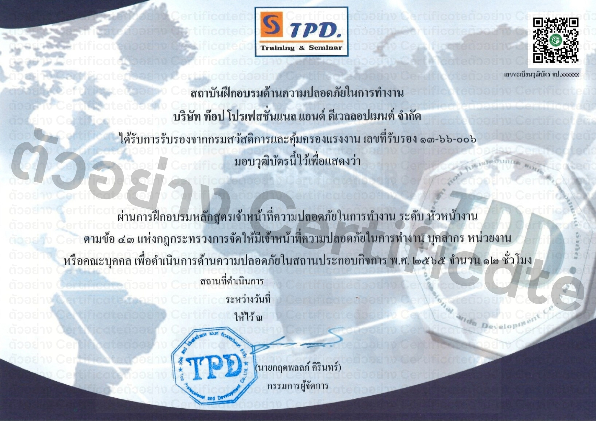 ศูนย์ฝึกอบรมได้รับอนุญาตเป็น ศูนย์ทดสอบมาตรฐานฝีมือแรงงาน จาก กรมพัฒนาฝีมือแรงงานแห่งชาติ พร้อมให้บริการจัดฝึกอบรมโดยวิทยากรผู้เชี่ยวชาญภายใต้แบรนด์ เซฟตี้อินไทย และ HRODTHAI เพื่อช่วยให้องค์กรก้าวสู่ความเป็นมืออาชีพ ทั้งในด้านความปลอดภัยและการบริหารทรัพยากรมนุษย์อย่างครบวงจรร์