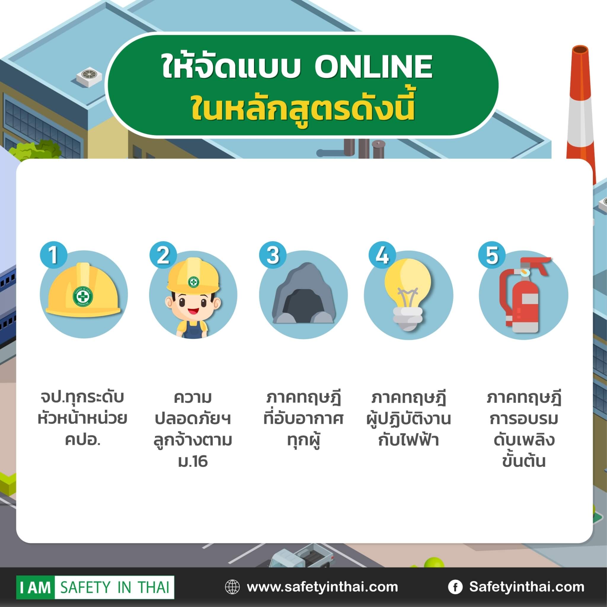เช่น การสอบ การฝึกอบรม หรือการกระทำกิจกรรมใด ๆ ที่มีผู้เข้าร่วมกิจกรรมจำนวนมากต้องดำเนินการด้วยวิธีการทางอิเล็กทรอนิกส์ เพื่อเป็นมาตรการป้องกันโรคด้วยการรักษาเว้นระยะห่างทางสังคม (Social Distancing) เพื่อให้การดำเนินการฝึกอบรมในด้านความปลอดภัย อาชีวอนามัย และสภาพแวดล้อมในการทำงานซึ่งอยู่ภายใต้การกำกับดูแลของกรมสวัสดิการและคุ้มครองแรงงานสอดคล้องกับมาตรการป้องกันโรคดังกล่าวกรมสวัสดิการและคุ้มครองแรงงานจึงกำหนดแนวทางการฝึกอบรมด้านความปลอดภัย อาชีวอนามัย และสภาพแวดล้อมในการทำงาน