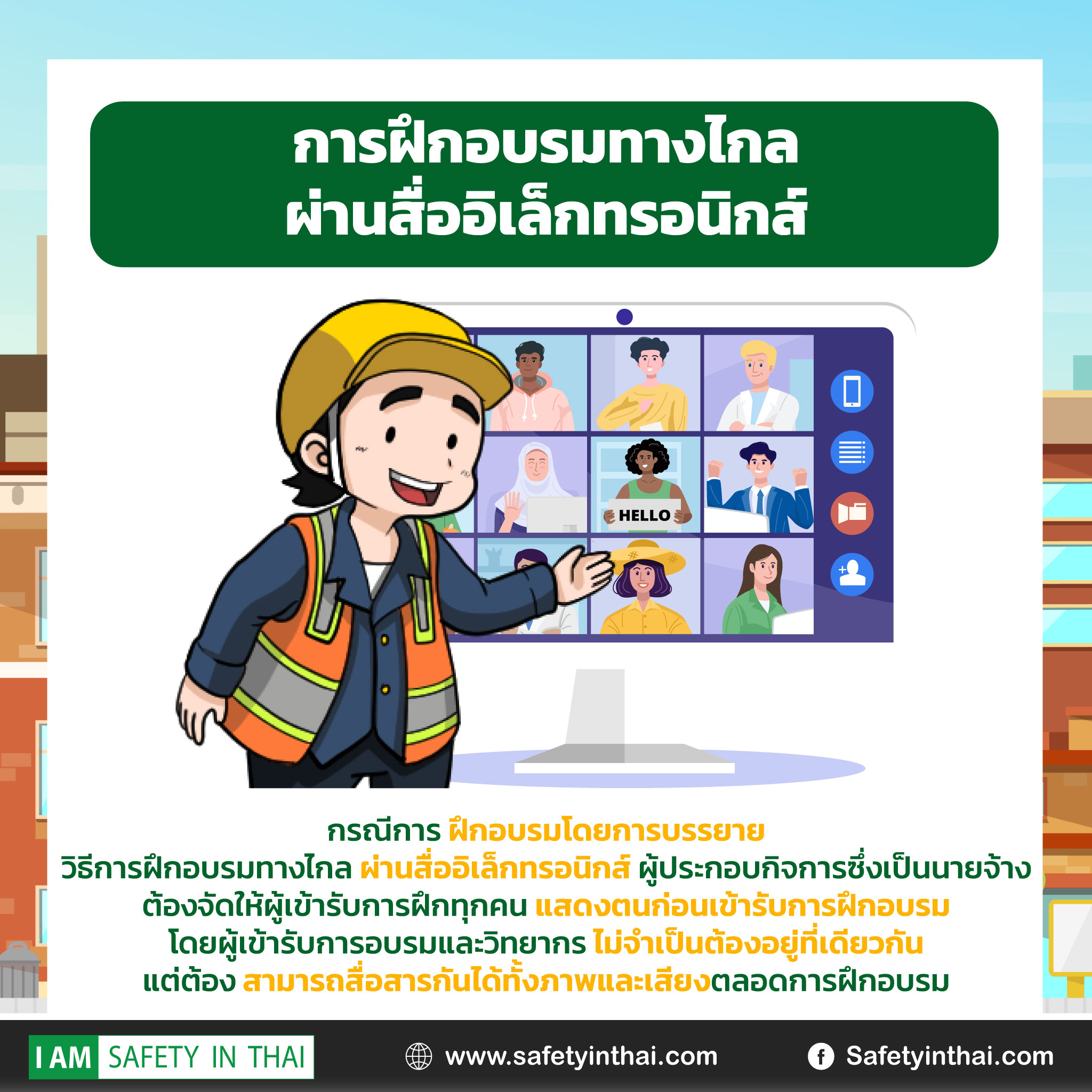 4. กรณีการฝึกอบรมโดยการบรรยายวิธีการฝึกอบรมทางไกลผ่านสื่ออิเล็กทรอนิกส์ ผู้ประกอบกิจการซึ่งเป็นนายจ้างต้องจัดให้ผู้เข้ารับการฝึกทุกคน แสดงตนก่อนเข้ารับการฝึกอบรมโดยผู้เข้ารับการอบรมและวิทยากรไม่จำเป็นต้องอยู่ที่เดียวกันแต่ต้องสามารถสื่อสารกันได้ทั้งภาพและเสียงตลอดการฝึกอบรม