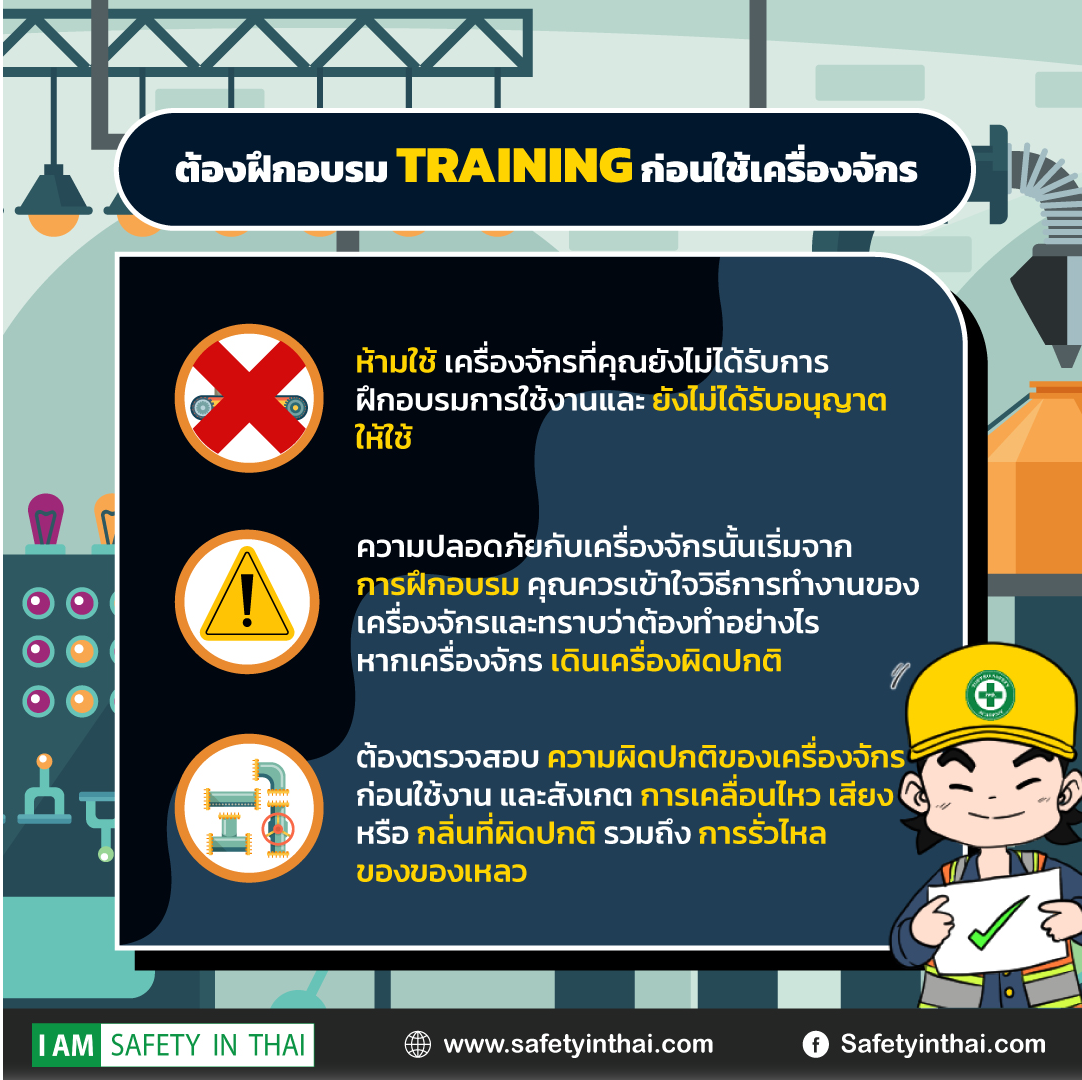 - ความปลอดภัยกับเครื่องจักรนั้น เริ่มจากการฝึกอบรมคุณควรเข้าใจวิธีการทำงานของเครื่องจักรและทราบว่าต้องทำอย่างไร หากเครื่องจักรเดินเครื่องผิดปกติ