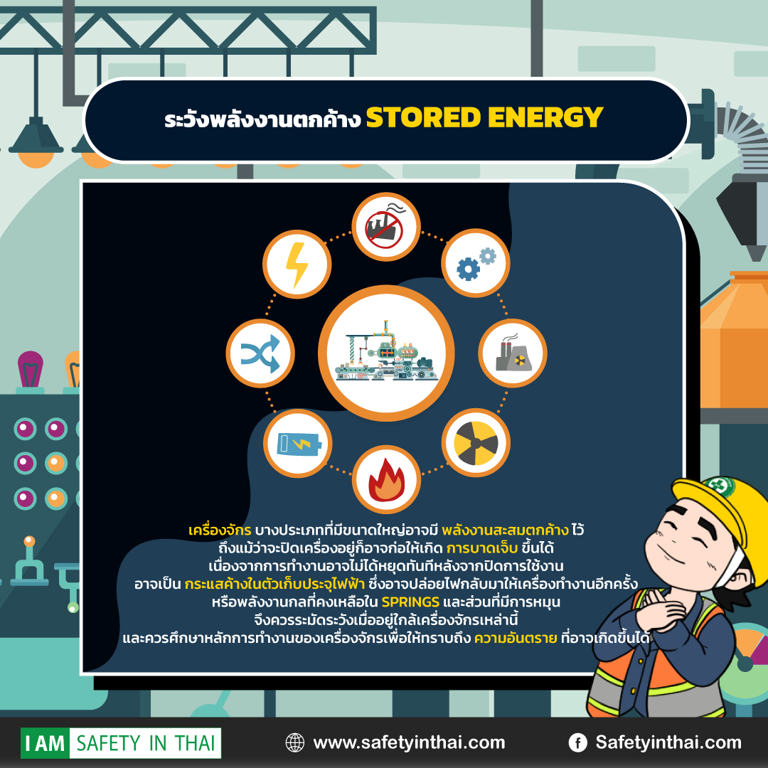 เครื่องบางประเภทเครื่องจักรที่มีขนาดใหญ่อาจมีพลังงานสะสมตกค้าง ไว้ถึงแม้ว่าจะปิดเครื่องอยู่ก็อาจก่อให้เกิด การบาดเจ็บ ขึ้นได้เนื่องจากการทำงานอาจไม่ได้หยุดทันทีหลังจากปิดการใช้งาน อาจเป็นกระแสค้างในตัวเก็บประจุไฟฟ้า ซึ่งอาจปล่อยไฟกลับมาให้เครื่องทำงานอีกครั้งหรือพลังงานกลที่คงเหลือใน SPRINGS และส่วนที่มีการหมุนจึงควรระมัดระวังเมื่ออยู่ใกล้เครื่องจักรเหล่านี้และควรศึกษาหลักการทำงานของเครื่องจักรเพื่อให้ทราบถึง ความอันตราย ที่อาจเกิดขึ้นได้