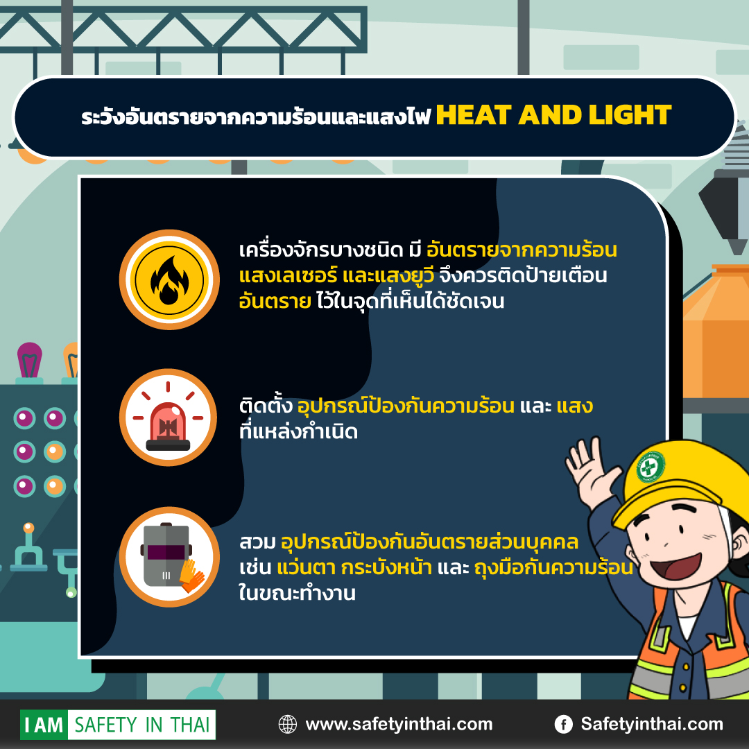 - เครื่องจักรบางชนิด มีอันตรายจากความร้อน แสงเลเซอร์ และแสงยูวี จึงควรติดป้ายเตือนอันตรายไว้ในจุดที่เห็นได้ชัดเจน