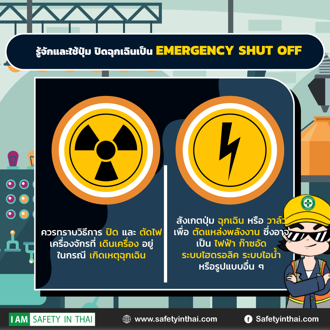 - ควรทราบวิธีการปิดและตัดไฟเคร่ืองจักรที่เดินเครื่องอยู่ ในกรณีเกิดเหตุฉุกเฉิน