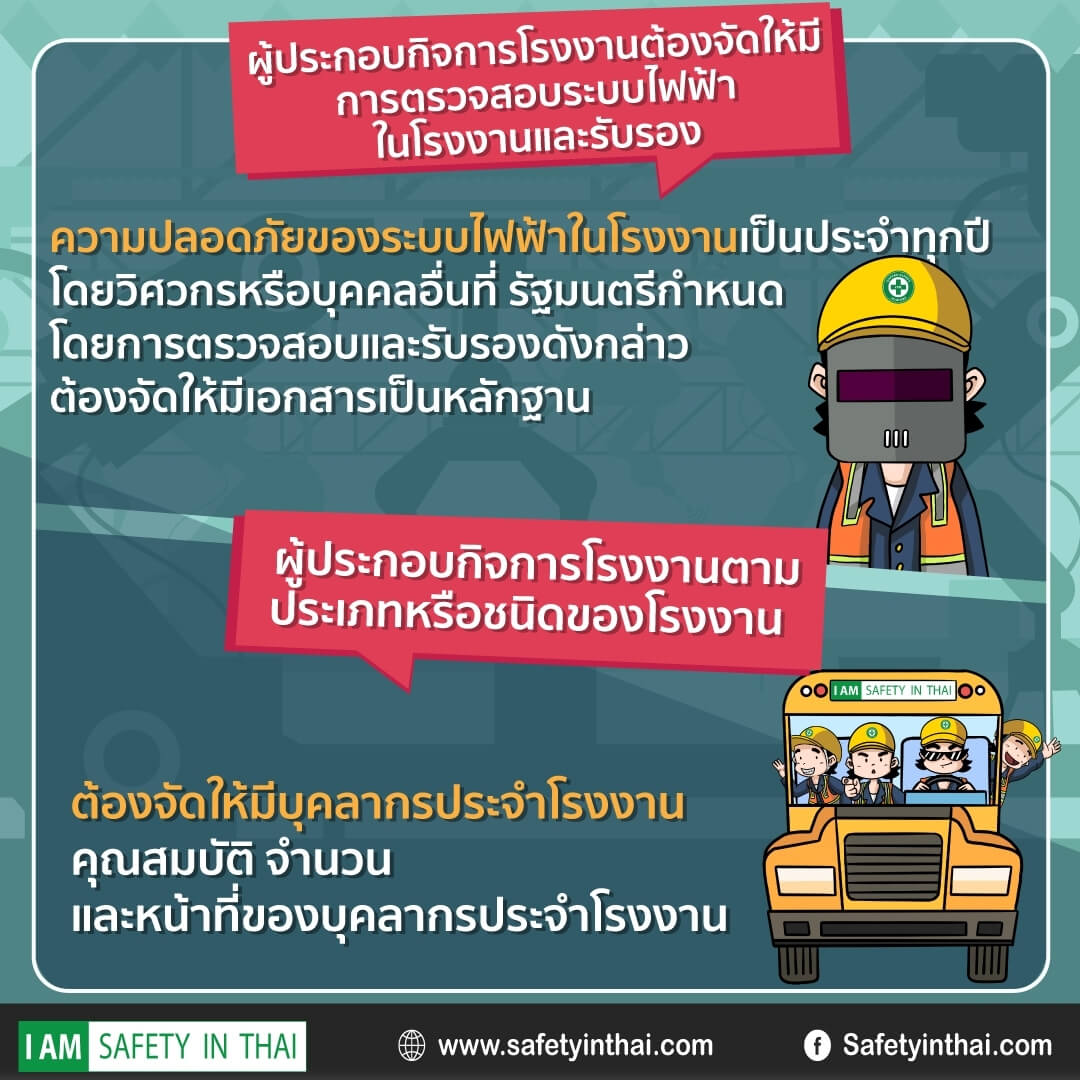 ข้อ ๕ ผู้ประกอบกิจการโรงงานต้องจัดให้มีการตรวจสอบระบบไฟฟ้าในโรงงานและรับรอง ความปลอดภัยของระบบไฟฟ้าในโรงงานเป็นประจำทุกปี โดยวิศวกรหรือบุคคลอื่นที่ รัฐมนตรีกำหนด โดยประกาศในราชกิจจานุเบกษา โดยการตรวจสอบและรับรองดังกล่าวต้องจัดให้มีเอกสารเป็นหลักฐาน