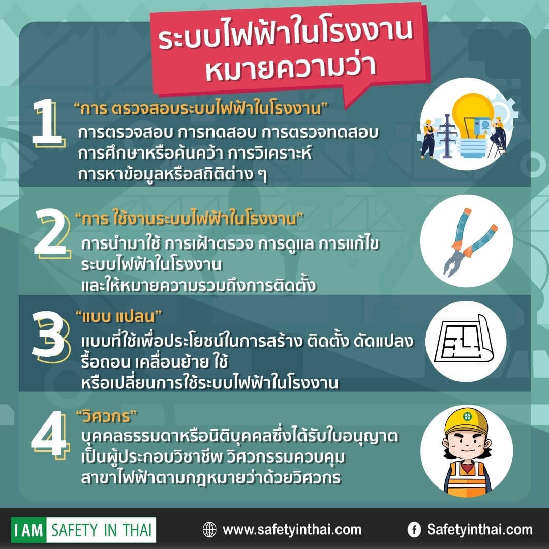 “การใช้งานระบบไฟฟ้าในโรงงาน” หมายความว่า การนำมาใช้ การเฝ้าตรวจ การดูแล การแก้ไข ระบบไฟฟ้าในโรงงาน และให้หมายความรวมถึงการติดตั้ง การซ่อม การปรับปรุง หรือการเพิ่มเติม ระบบไฟฟ้าในโรงงานด้วย