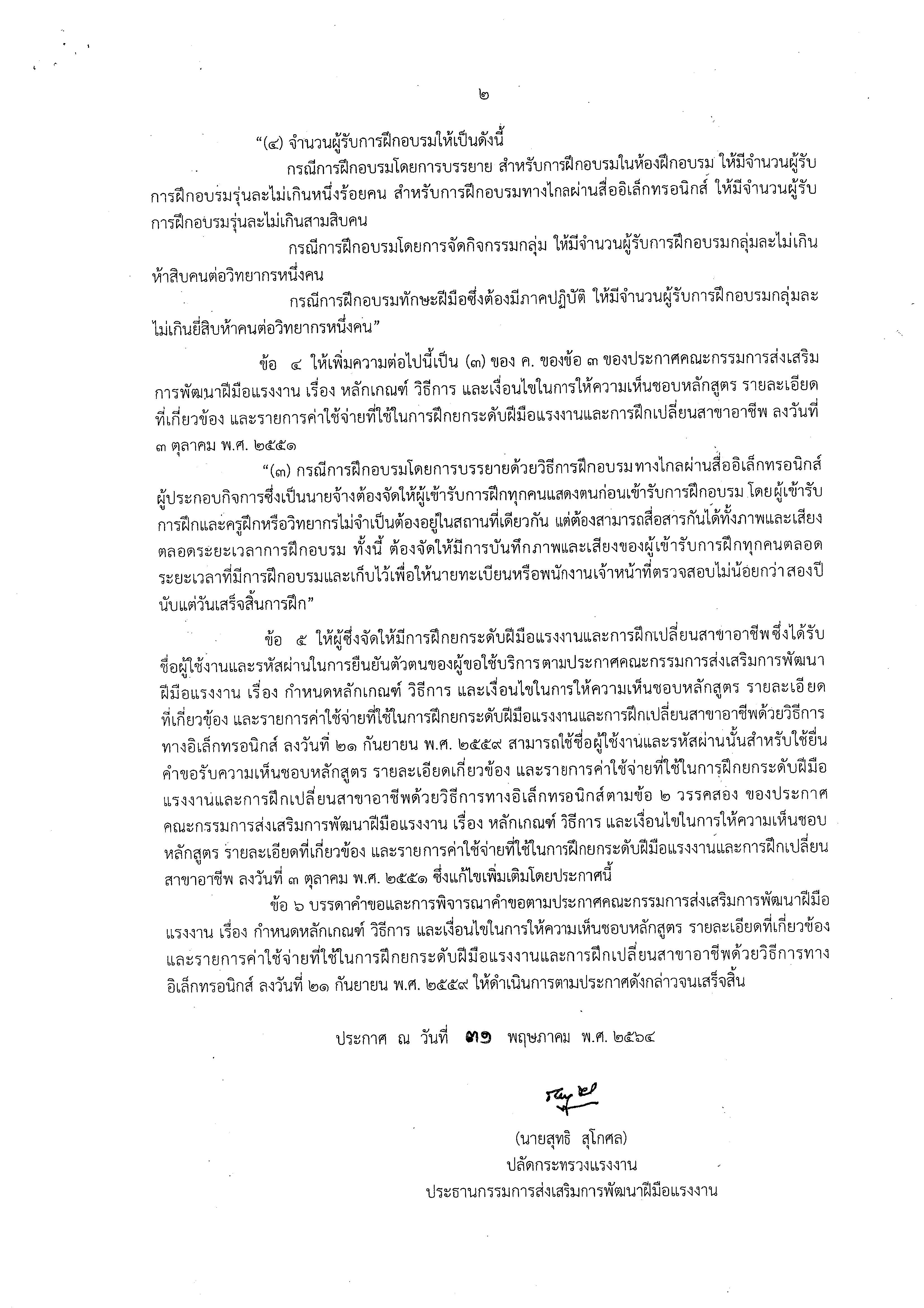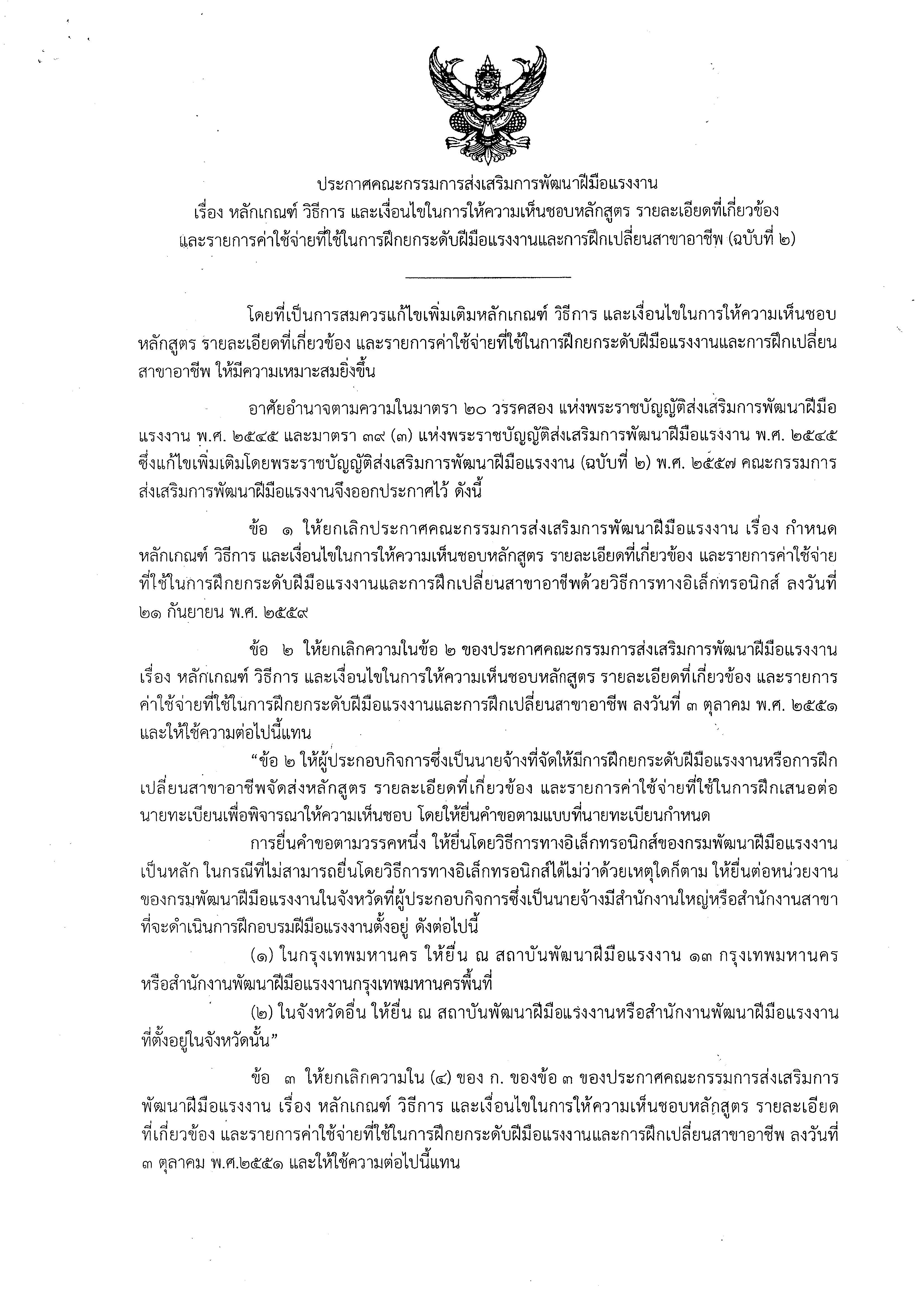 เรื่อง หลักเกณฑ์ วิธีการ และเงื่อนไขในการให้ความเห็นชอบหลักสูตร รายละเอียดที่เกี่ยวข้องและรายการค่าใช้จ่ายที่ใช้ในการฝึกยกระดับฝีมือแรงงานและการฝึกเปลี่ยนสาขาอาชีพ (ฉบับที่ ๒)