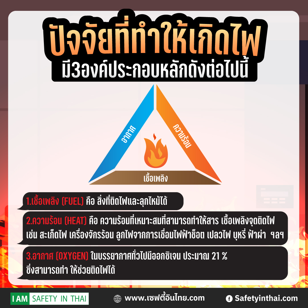 เช่น สะเก็ดไฟ ลูกไฟจากการเชื่อม เครื่องจักรร้อน ไฟฟ้าช็อต เปลวไฟ บุหรี่ ฟ้าผ่า ฯลฯ3.อากาศ (OXYGEN) ในบรรยากาศทั่วไปมีออกซิเจน ประมาณ 21 % อยู่แล้ว ซึ่งสามารถทำให้ช่วยติดไฟได้