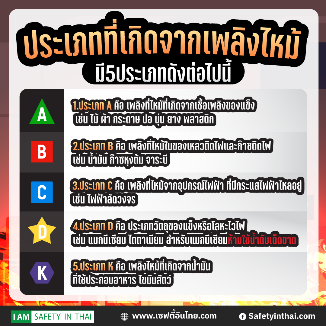 1.ประเภท A คือ เพลิงที่ไหม้ที่เกิดจากเชื้อเพลิงของแข็ง เช่น ไม้ ผ้า กระดาษ ปอ นุ่น ยาง พลาสติก