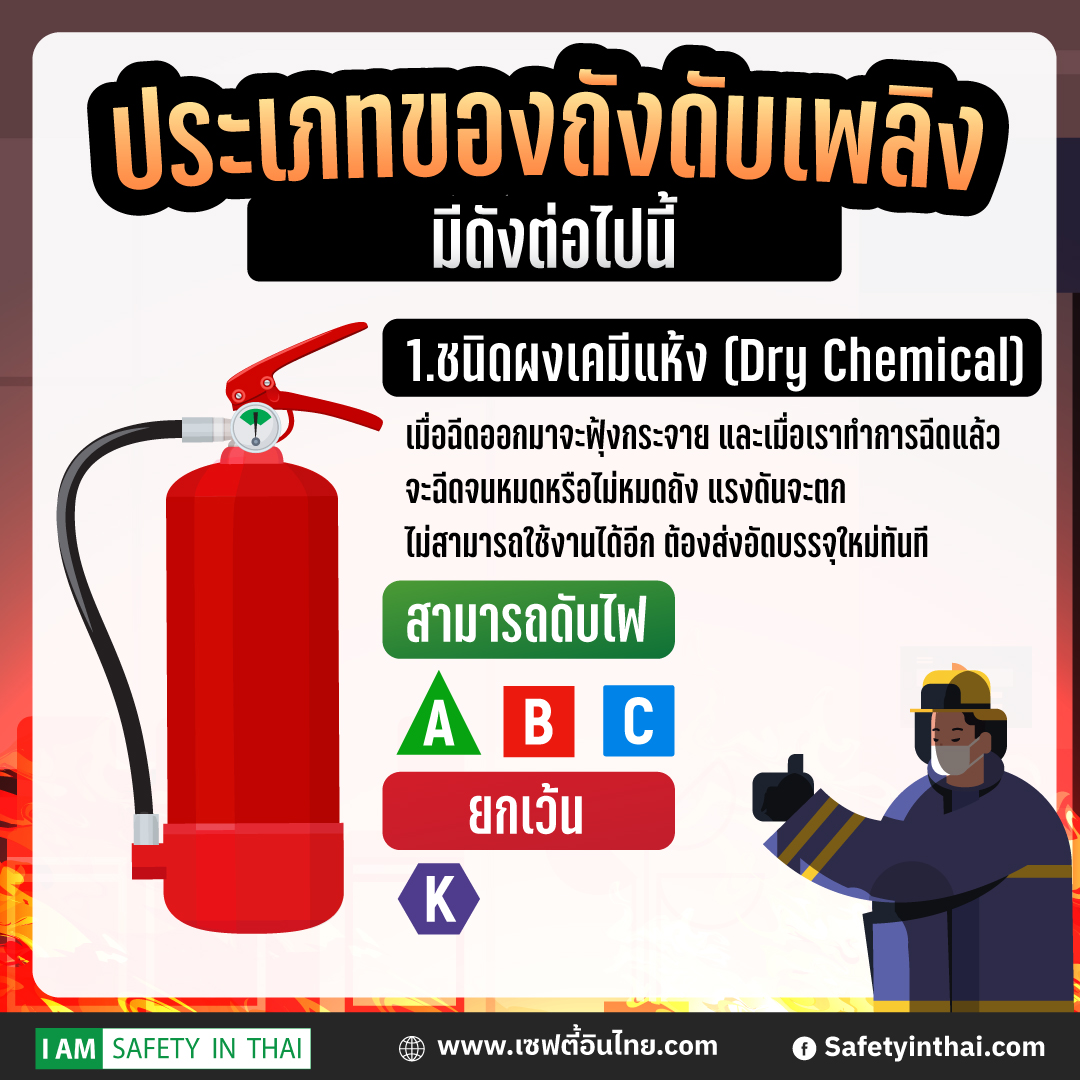 1.ชนิดผงเคมีแห้ง (Dry Chemical) สามารถดับไฟได้เกือบทุกประเภท A B C ยกเว้น CLASS Kราคาถูก หาซื้อง่าย แต่มีข้อเสียคือเมื่อฉีดออกมาจะฟุ้งกระจาย และเมื่อเราทำการฉีดแล้ว จะฉีดจนหมดหรือไม่หมดถัง แรงดันจะตก ไม่สามารถใช้งานได้อีกต้องส่งอัดบรรจุใหม่ทันที