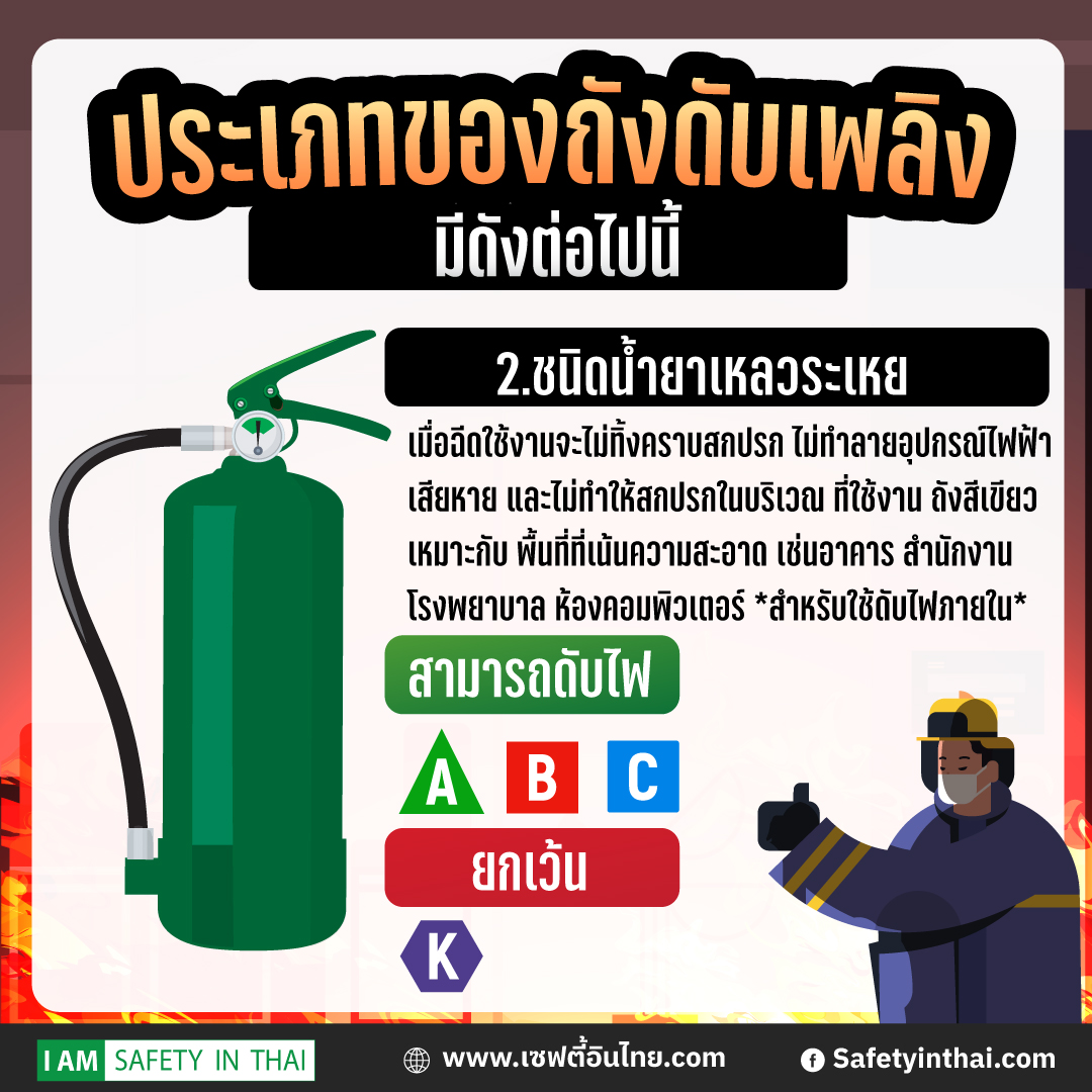 2.ชนิดน้ำยาเหลวระเหย สามารถดับไฟได้เกือบทุกประเภท A B C ยกเว้น CLASS K ราคาถูกกว่าฮาโรตรอน หาซื้อง่าย