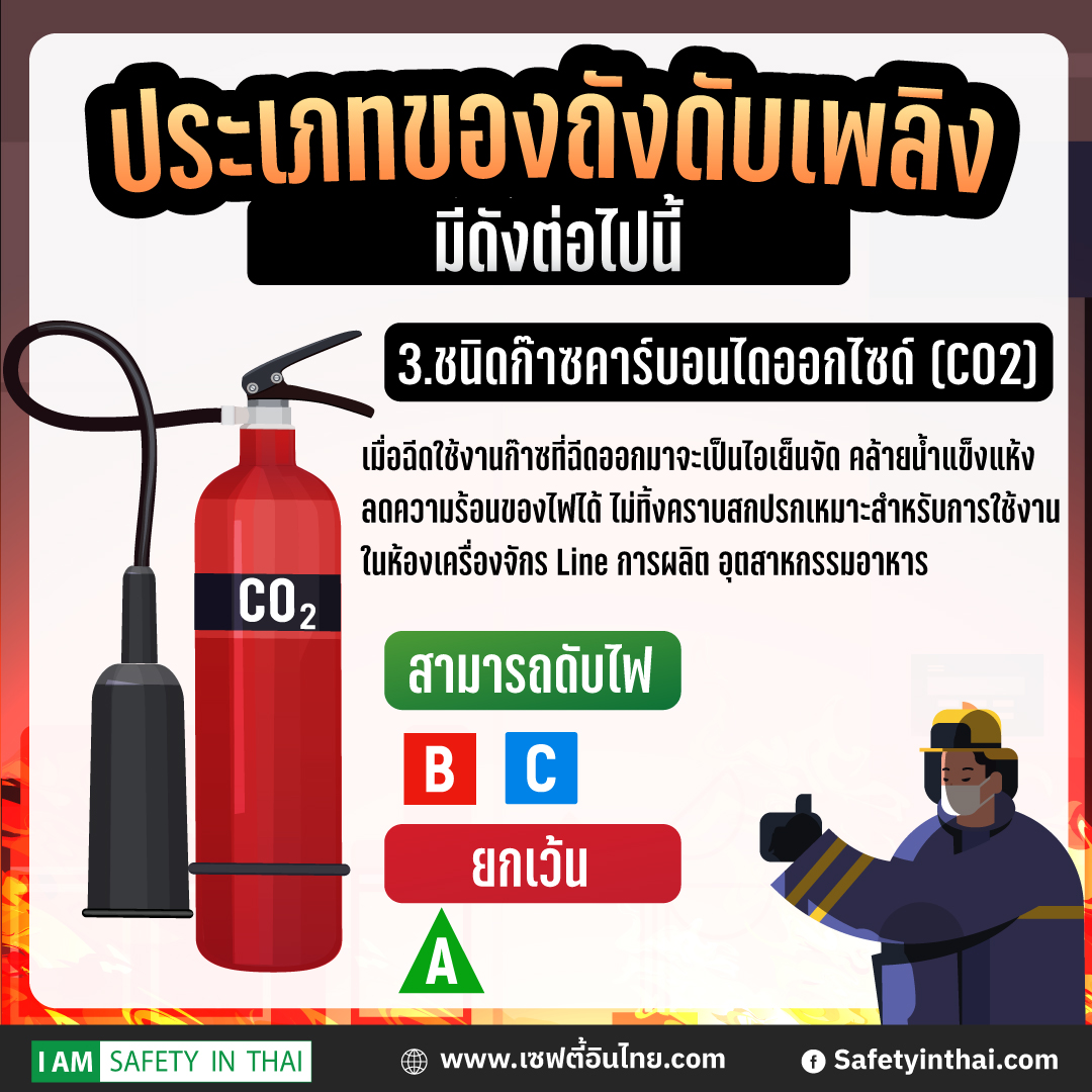 3.ชนิดก๊าซคาร์บอนไดออกไซด์ (CO2) สารเคมีภายในบรรจุก๊าซคาร์บอนไดออกไซด์ ก๊าซที่ฉีดออกมาจะเป็นไอเย็นจัด คล้ายน้ำแข็งแห้ง ลดความร้อนของไฟได้ ไม่ทิ้งคราบสกปรก สามารถดับไฟได้ประเภท B C เหมาะสำหรับการใช้งานในห้องเครื่องจักร Line การผลิต อุตสาหกรรมอาหาร ถังสีแดง ปลายกระบอกฉีดจะใหญ่เป็นพิเศษ
