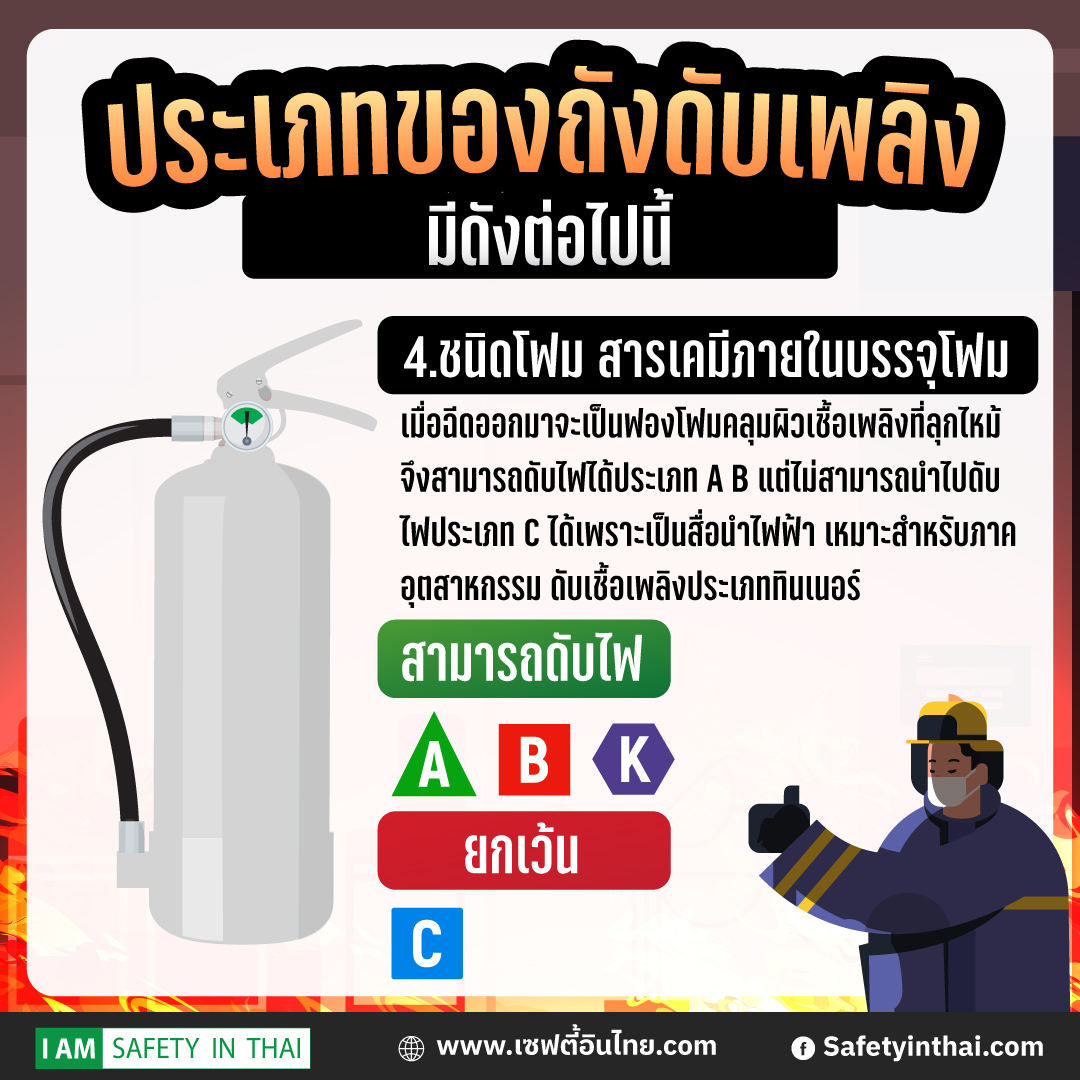 4.ชนิดโฟม สารเคมีภายในบรรจุโฟม เมื่อฉีดออกมาจะเป็นฟองโฟมคลุมผิวเชื้อเพลิงที่ลุกไหม้ จึงสามารถดับไฟได้ประเภท A B