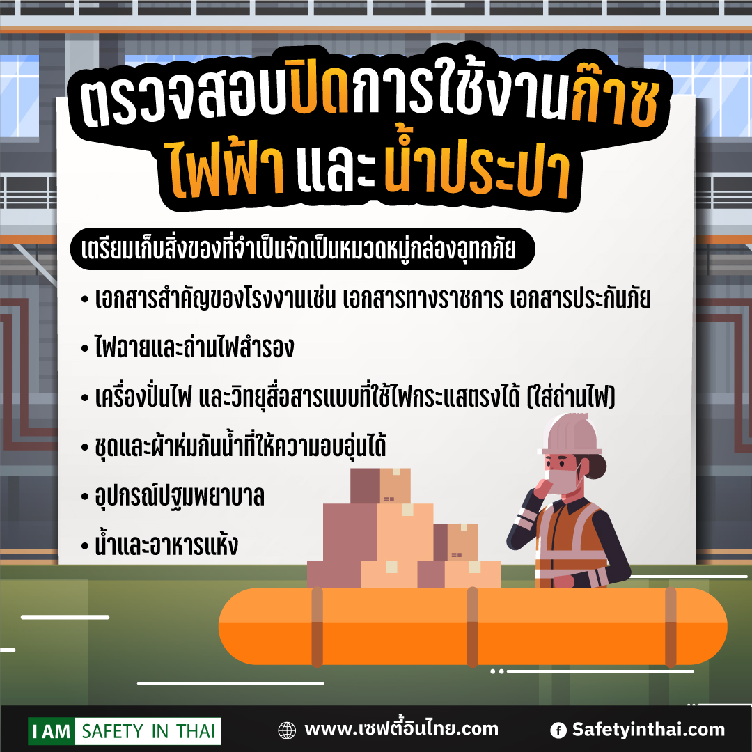 • อย่ารอให้น้ำท่วมขึ้นถึงอุปกรณ์ให้เคลื่อนย้ายอุปกรณ์ เครื่องจักร สารเคมี ที่
