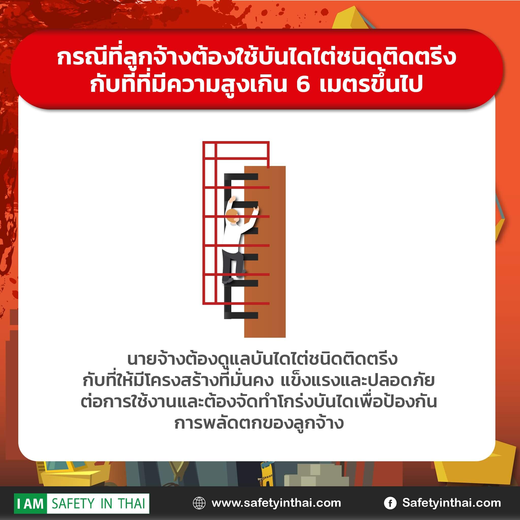 ข้อ ๑๓ ในกรณีที่ลูกจ้างต้องใช้บันไดไต่ชนิดติดตรึงกับที่ที่มีความสูงเกินหกเมตรขึ้นไป เพื่อทำงานในที่สูง นายจ้างต้องดูแลบันไดไต่ชนิดติดตรึงกับที่ให้มีโครงสร้างที่มั่นคง แข็งแรง และปลอดภัยต่อการใช้งานและต้องจัดทำโกร่งบันไดเพื่อป้องกันการพลัดตกของลูกจ้าง