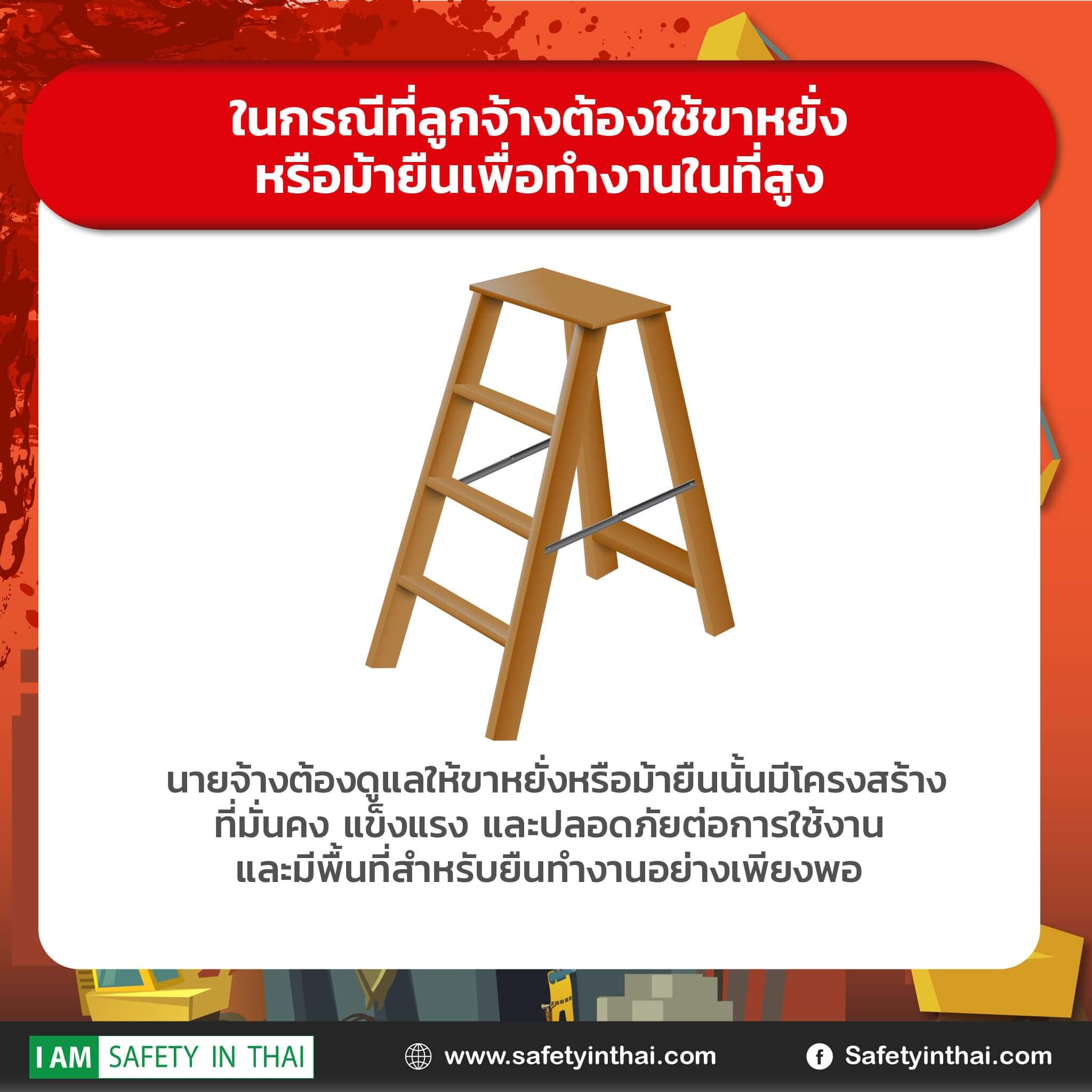 ข้อ ๑๔ ในกรณีที่ลูกจ้างต้องใช้ขาหยั่งหรือม้ายืนเพื่อทำงานในที่สูง นายจ้างต้องดูแล ให้ขาหยั่งหรือม้ายืนนั้นมีโครงสร้างที่มั่นคง แข็งแรงและปลอดภัยต่อการใช้งาน และมีพื้นที่สำหรับ ยืนทำงานอย่างเพียงพอ
