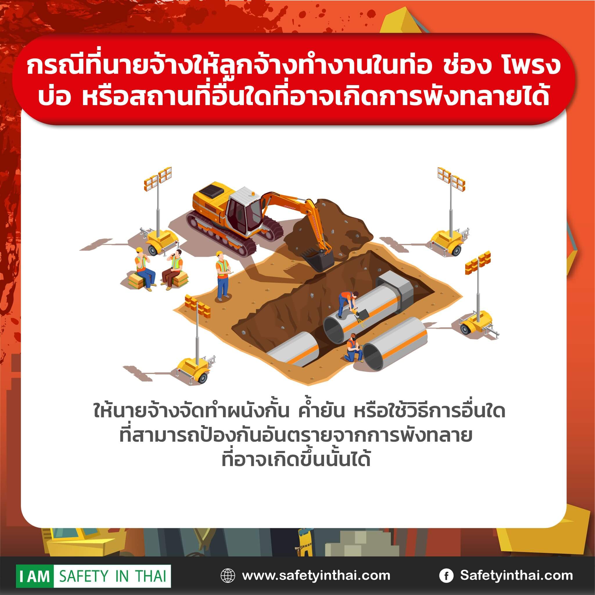 ข้อ ๒๑ ในกรณีที่นายจ้างให้ลูกจ้างทำงานในท่อ ช่อง โพรง บ่อ หรือสถานที่อื่นใด ที่อาจเกิดการพังทลายได้ ให้นายจ้างจัดทำผนังกั้น ค้ำยัน หรือใช้วิธีการอื่นใดที่สามารถป้องกัน อันตรายจากการพังทลายที่อาจเกิดขึ้นนั้นได้