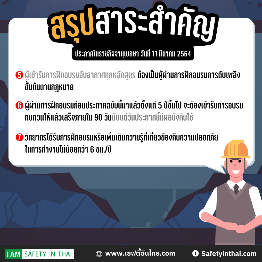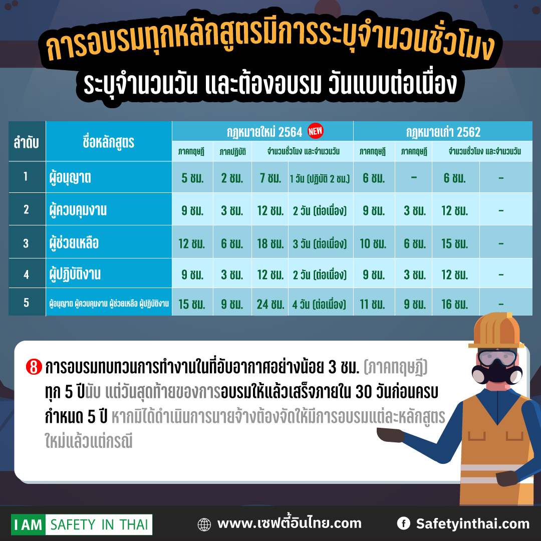 - การอบรมทบทวนการทำงานในที่อับอากาศอย่างน้อย 3 ชม. (ภาคทฤษฎี) ทุก 5 ปีนับแต่วันสุดท้ายของ การอบรม ให้ แล้วเสร็จภายใน 30 วันก่อนครบกำหนด 5 ปี หากมิได้ดำเนินการนายจ้างต้องจัดให้มีการ อบรมแต่ละหลักสูตรใหม่ แล้วแต่กรณี