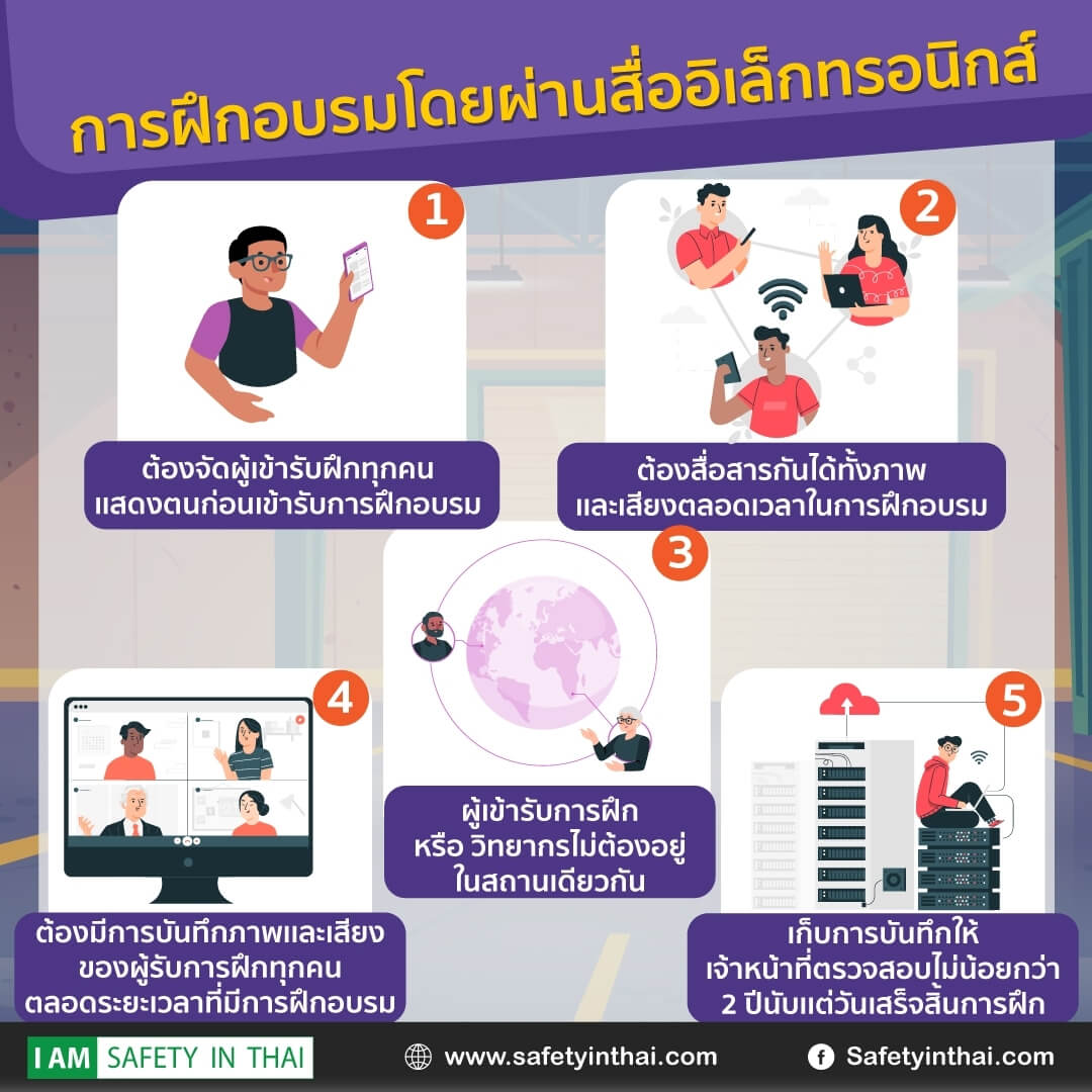 (๓) กรณีการฝึกอบรมโดยการบรรยายด้วยวิธีกรฝึกอบรมทางไกลผ่านสื่ออิเล็กทรอนิกส์ผู้ประกอบกิจการซึ่งเป็นนายจ้างต้องจัดให้ผู้เข้ารับการฝึกทุกคนแสคงตนก่อนเข้ารับการฝึกอบรม โดยผู้เข้ารับกและครูฝึกหรือวิทยากรไม่จำเป็นต้องอยู่ในสถานที่เดียวกัน แต่ต้องสามารถสื่อสารกันได้ทั้งภตลอดระยะเวลาการฝึกอบรม ทั้งนี้ ต้องจัดให้มีการบันทึกภาพและเสียงของผู้เข้ารับการฝึกทุกคนตลอดระยะเวลาที่มีการฝึกอบรมและเก็บไว้เพื่อให้นายทะเบียนหรือพนักงานเจ้าหน้าที่ตรวจสอบไม่น้อยกว่าสองปีนับแต่วันเสร็จสิ้นการฝึก"