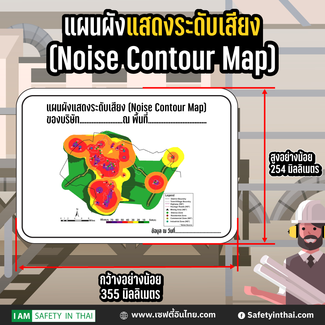 แผนผังแสดงระดับเสียง (Noise Contour Map) เป็นภาพกราฟิกที่แสดงให้เห็นถึงระดับเสียงในพื้นที่ต่างๆ ภายในสถานที่หนึ่งๆ โดยเฉพาะในบริเวณที่มีเสียงดัง เช่น โรงงานอุตสาหกรรม หรือสถานที่ก่อสร้าง เพื่อให้เห็นภาพรวมของระดับเสียงและสามารถนำข้อมูลไปใช้ในการวางแผนป้องกันอันตรายจากเสียงดังได้อย่างมีประสิทธิภาพ