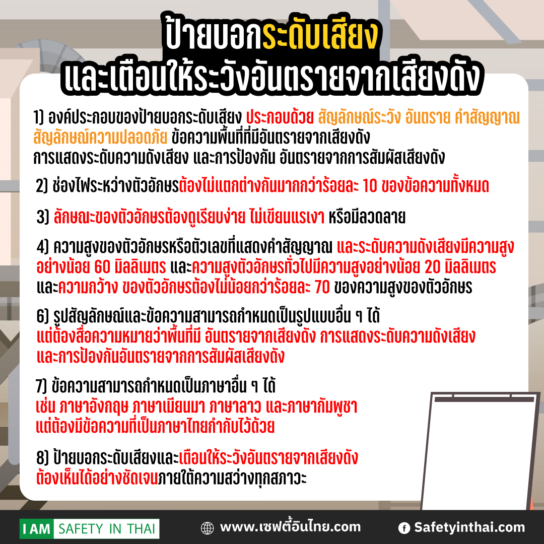 ๘) ป้ายบอกระดับเสียงและเตือนให้ระวังอันตรายจากเสียงดัง ต้องเห็นได้อย่างชัดเจนภายใต้ความสว่าง ทุกสภาวะ