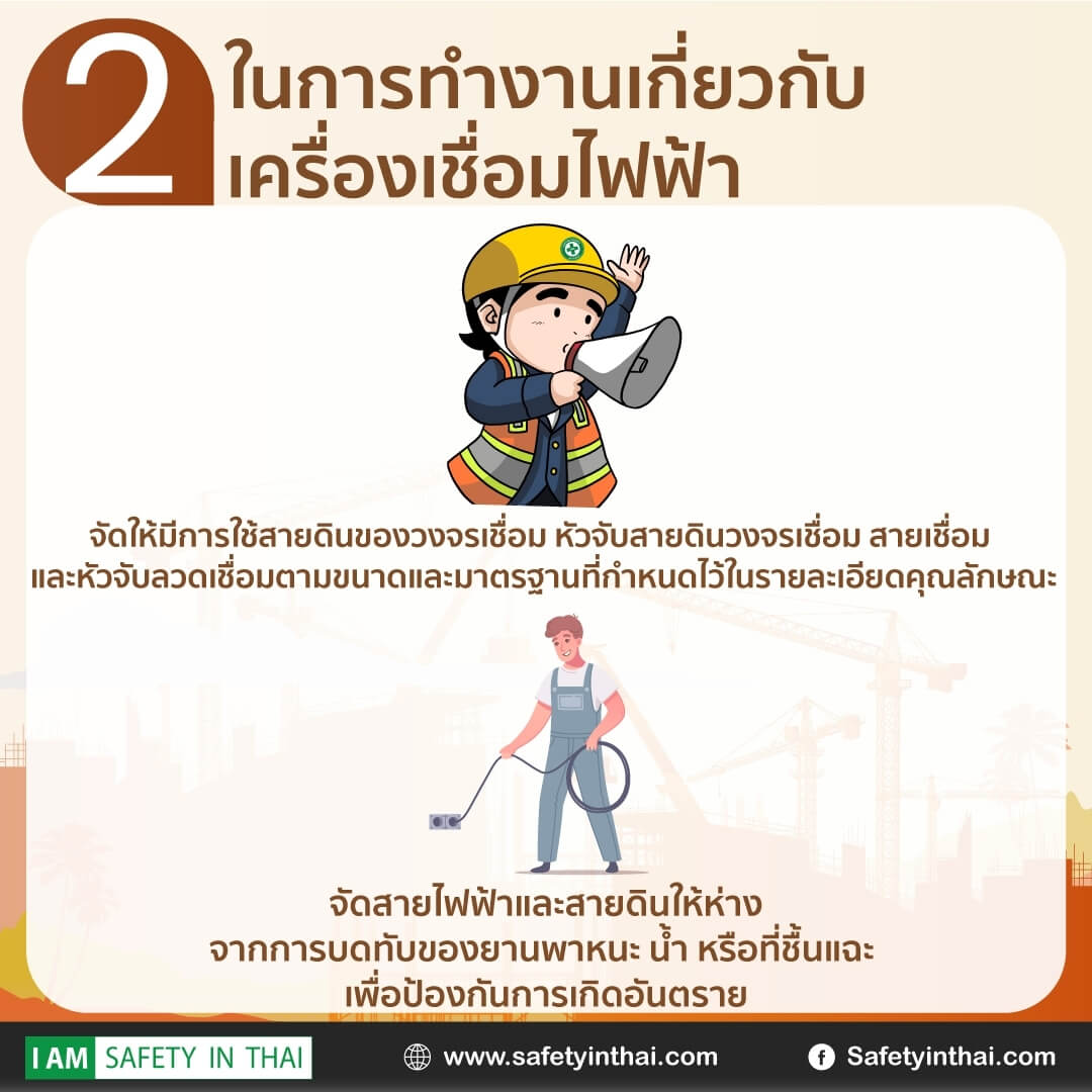 3.สายไฟฟ้า สายดิน ต้องมีอุปกรณ์ป้องกันการเสียหายจากการบดทับ หรือเปียกน้ำ ชื้นแฉะ และสถานที่ทำงานต้องมีแสงสว่างและการระบายอากาศที่เหมาะสม